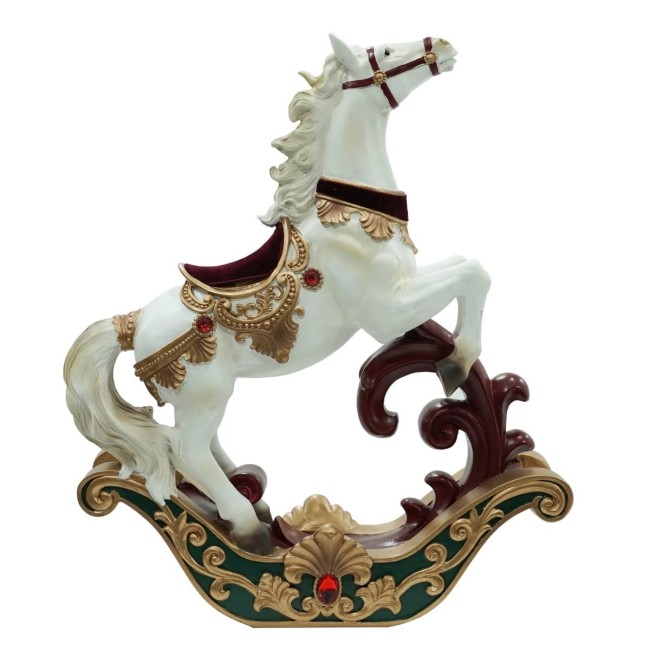 Porta un tocco di fascino fiabesco nelle tue decorazioni natalizie con il cavallo rampante natalizio con base a dondolo, un elemento scenografico capace di impreziosire ogni ambiente. Realizzato in resina di alta qualità, questo decoro si distingue per la cura dei dettagli: il manto bianco del cavallo è arricchito da pregiati decori dorati, finiture bordeaux e verdi che richiamano i colori classici del Natale. La base a dondolo, finemente lavorata, dona un’eleganza senza tempo, rendendolo perfetto sia per l’arredo domestico che per vetrine e allestimenti natalizi professionali.