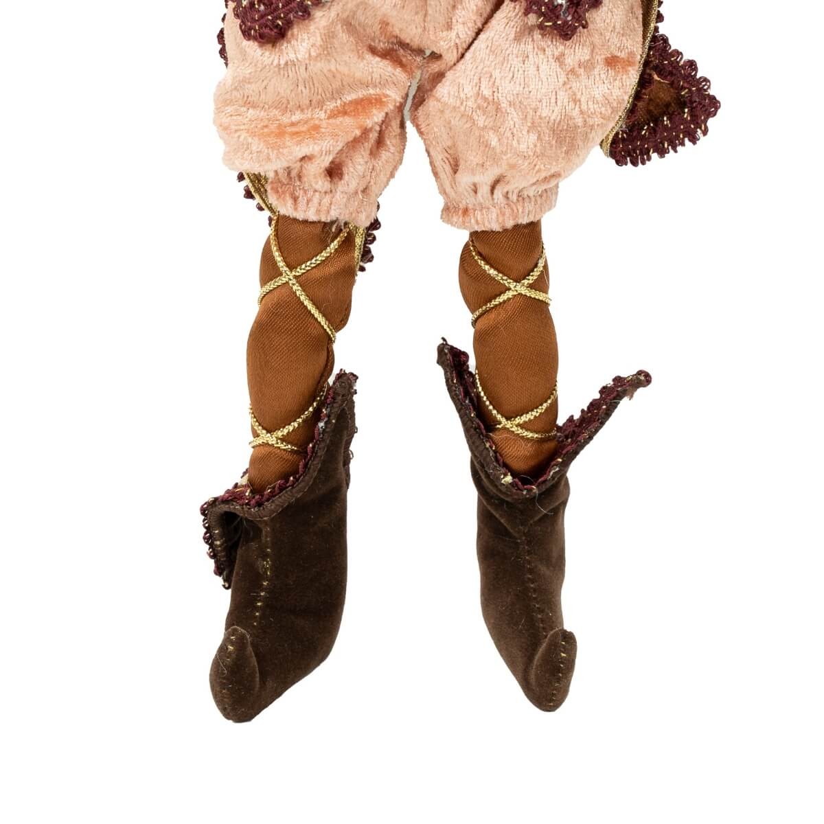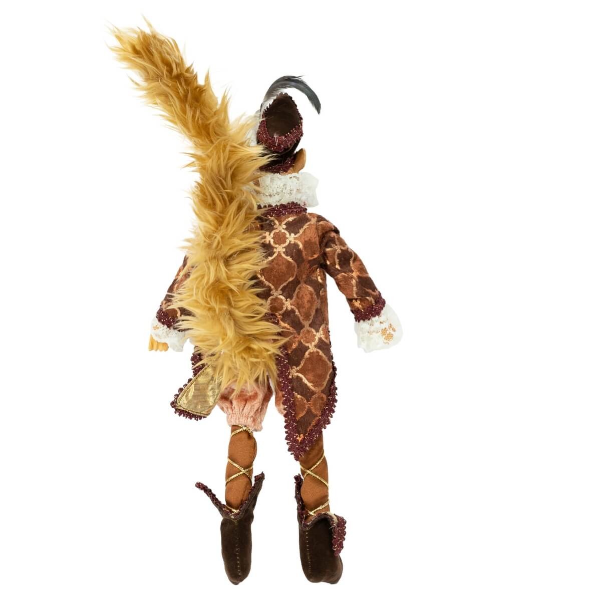 Realizzato con materiali di alta qualità – 80% poliestere per gli abiti in velluto e dettagli sartoriali, e 20% resina per il volto scolpito – Mr. Scoiattolo indossa un cappello con piuma scenografica, giacca decorata con bottoni dorati e stivali vintage.