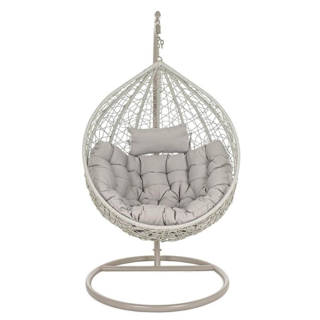 La seduta, ampia e accogliente, misura 75 cm di profondità, 102 cm di larghezza e 120 cm di altezza, ed è completata da un cuscino grigio imbottito che avvolge il corpo offrendo un comfort superiore. L’intera struttura, alta 200 cm con una base stabile da 100 cm di diametro, garantisce sicurezza e stabilità anche durante l’oscillazione.