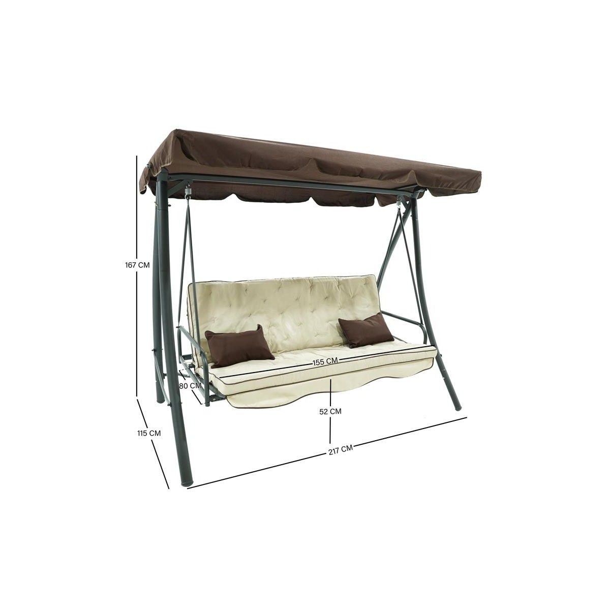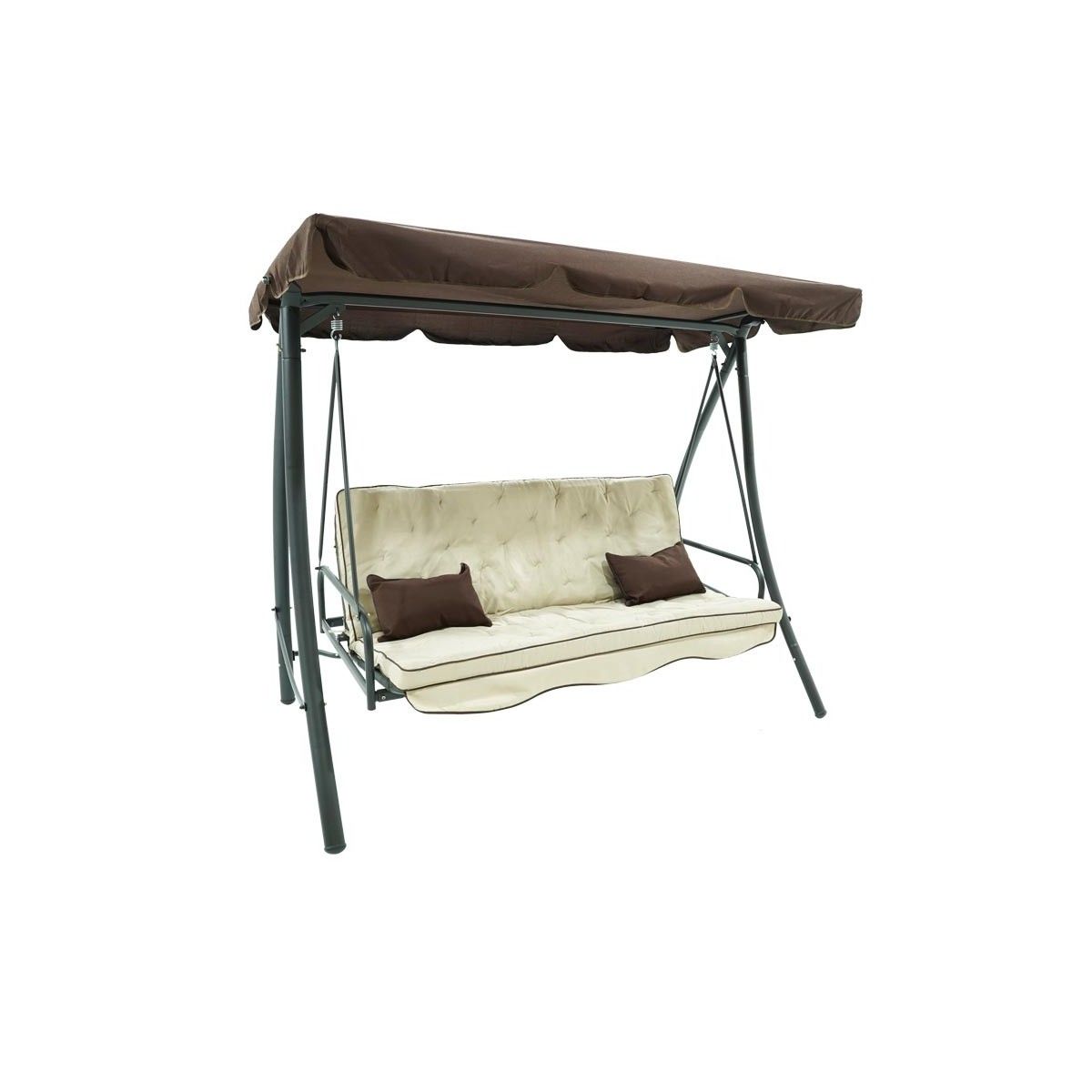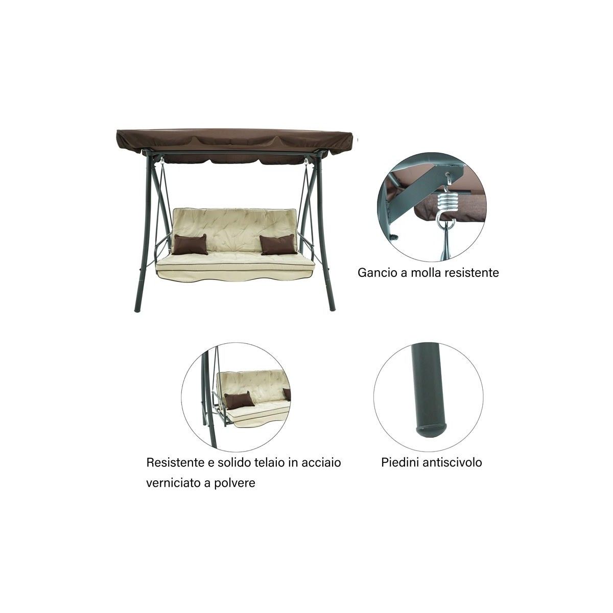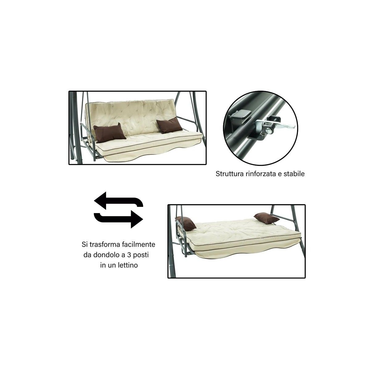 Il nuovo dondolo Andromeda Grigio si distingue per la sua qualità e resistenza, la sua struttura è realizzata in ferro con pali dal diametro 62x38 mm e un comodo cuscino imbottito che vi garantirà il massimo comfort. Il tettuccio parasole marrone è regolabile in tessuto impermeabile; questo dondolo multifunzionale si può facilmente trasformare da dondolo a 3 posti in un comodo letto matrimoniale.