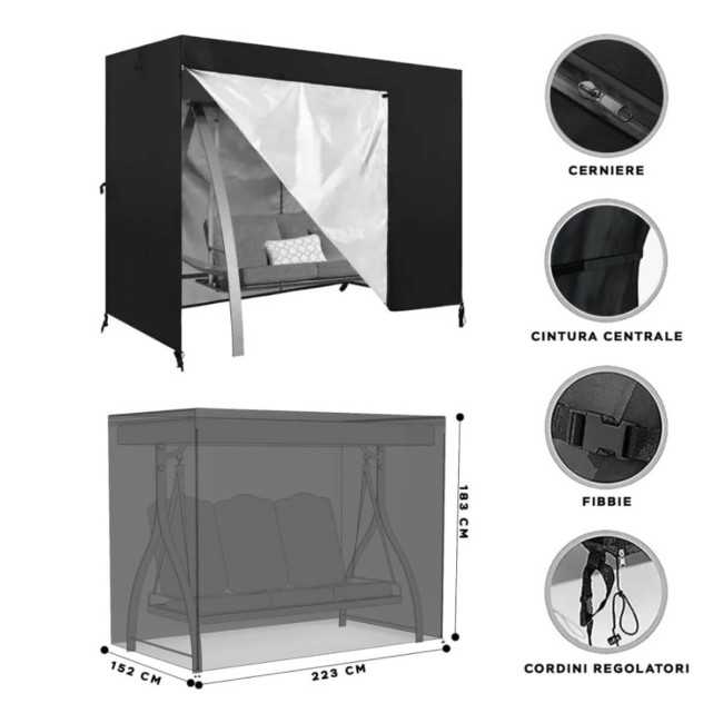 Proteggi il tuo dondolo da giardino con la copertura Stilè, realizzata in Poliestere con tessuto Oxford 210D per garantire la massima resistenza e durata. Con dimensioni di 223x152xH.183 cm, questa copertura offre una protezione completa contro pioggia, neve e raggi UV, grazie al suo strato impermeabile e isotermico.