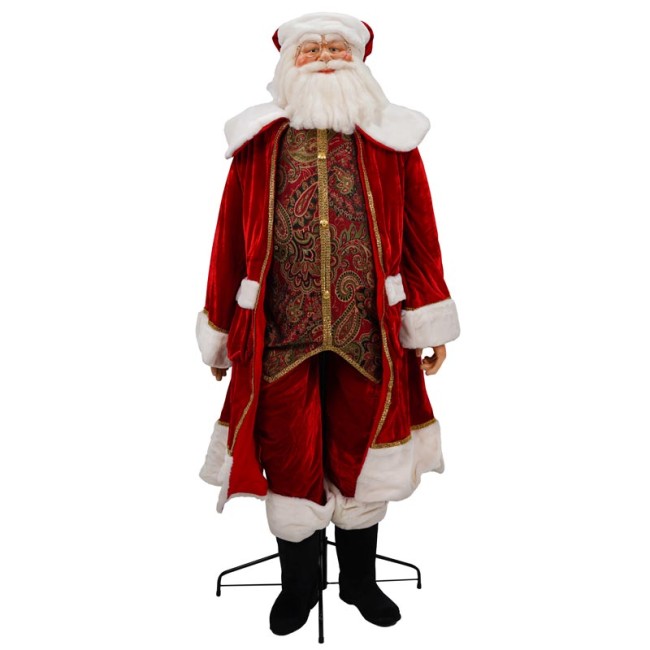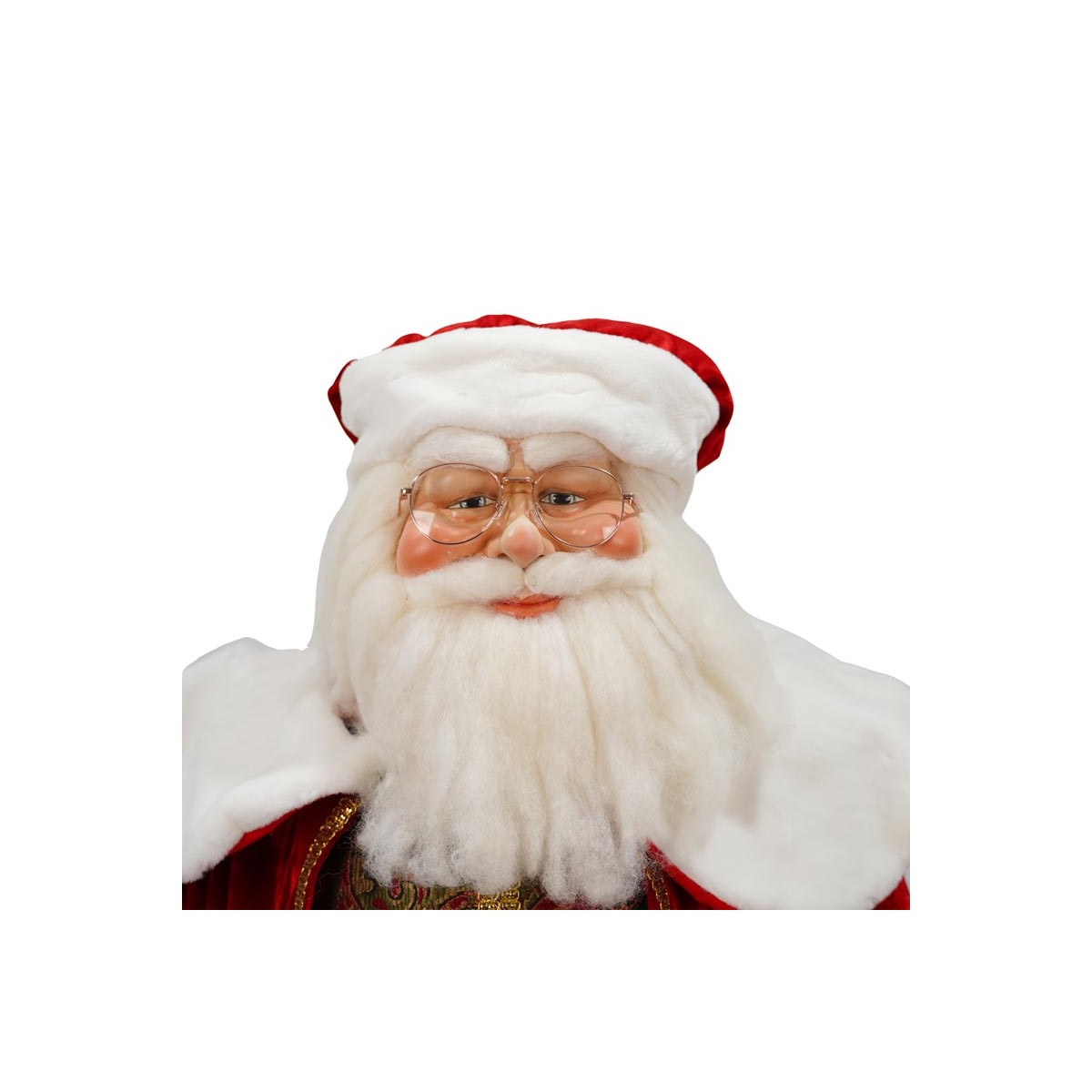 Celebra le feste con il maestoso Babbo Natale su stand alto 180 cm, un decoro natalizio imponente e raffinato che diventa il protagonista assoluto di ogni ambiente. Indossa un elegante abito rosso bordato di bianco, arricchito da dettagli preziosi che lo rendono unico e scenografico.