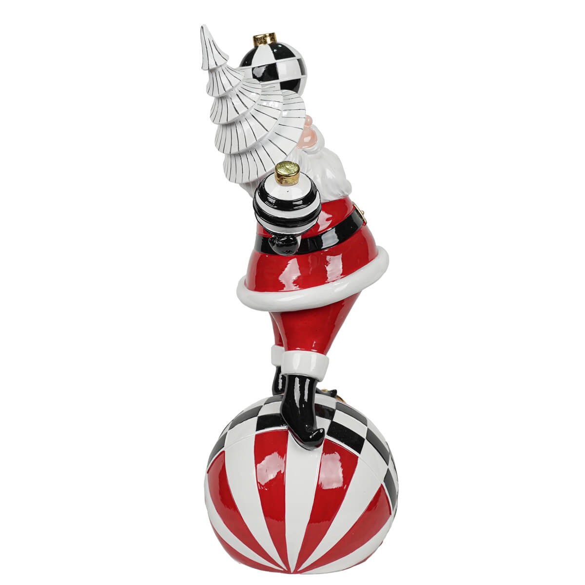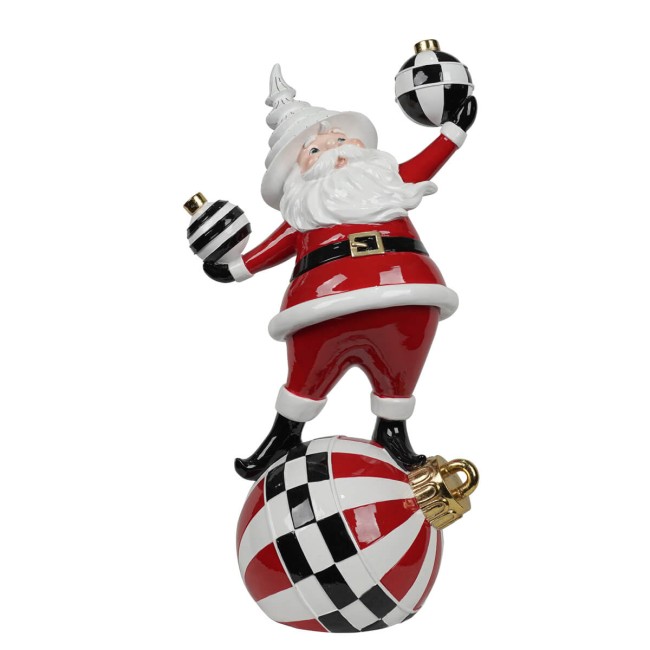 La figura raffigura Babbo Natale in equilibrio su una grande sfera decorata, in un design dinamico e divertente che conquista grandi e piccini. Le dimensioni generose (21,5x15,5xH.42,5 cm) la rendono perfetta per essere esposta su camini, tavoli, ingressi o vetrine natalizie, diventando subito il punto focale dell’ambiente.