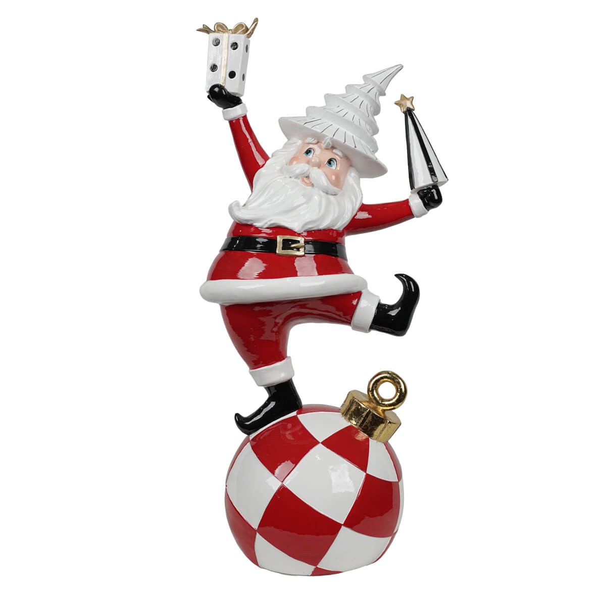 Rendi la tua casa ancora più magica durante le feste con il Babbo Natale su sfera in resina, una decorazione natalizia elegante e divertente che cattura perfettamente lo spirito del Natale. Questa figura, curata nei minimi dettagli, raffigura Babbo Natale in equilibrio su una grande sfera rossa e bianca, mentre tiene in mano un pacchetto regalo e un piccolo alberello con stella dorata.