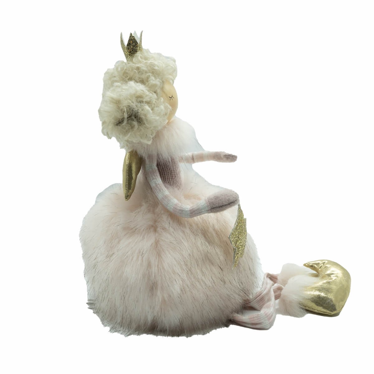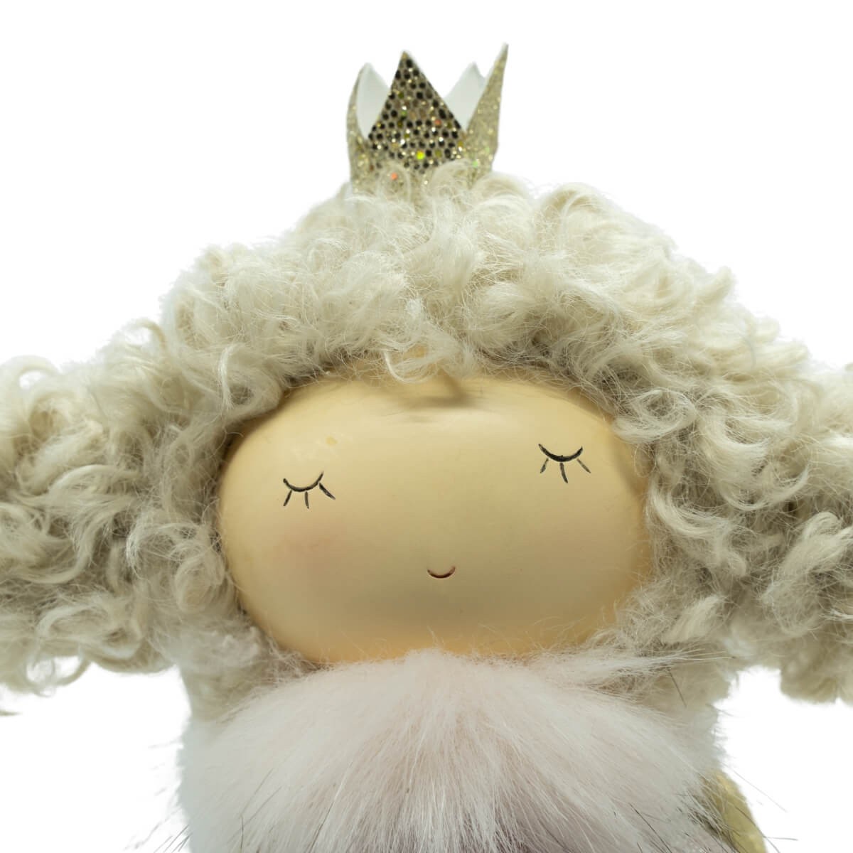 Realizzata con tessuti soffici e dettagli curati, come il colletto in pelliccia sintetica e i riccioli biondi, questa decorazione è ideale per essere posizionata su mensole, caminetti o mobili. Il viso dolce con occhi chiusi regala un senso di tranquillità e sogno, rendendola anche un’ottima idea regalo.