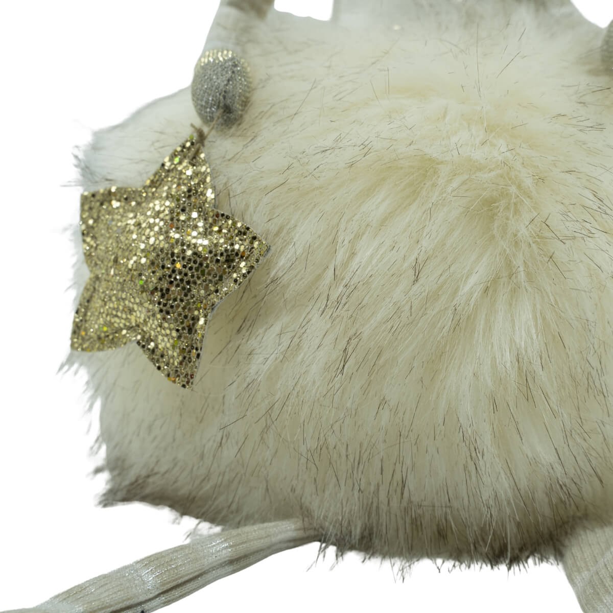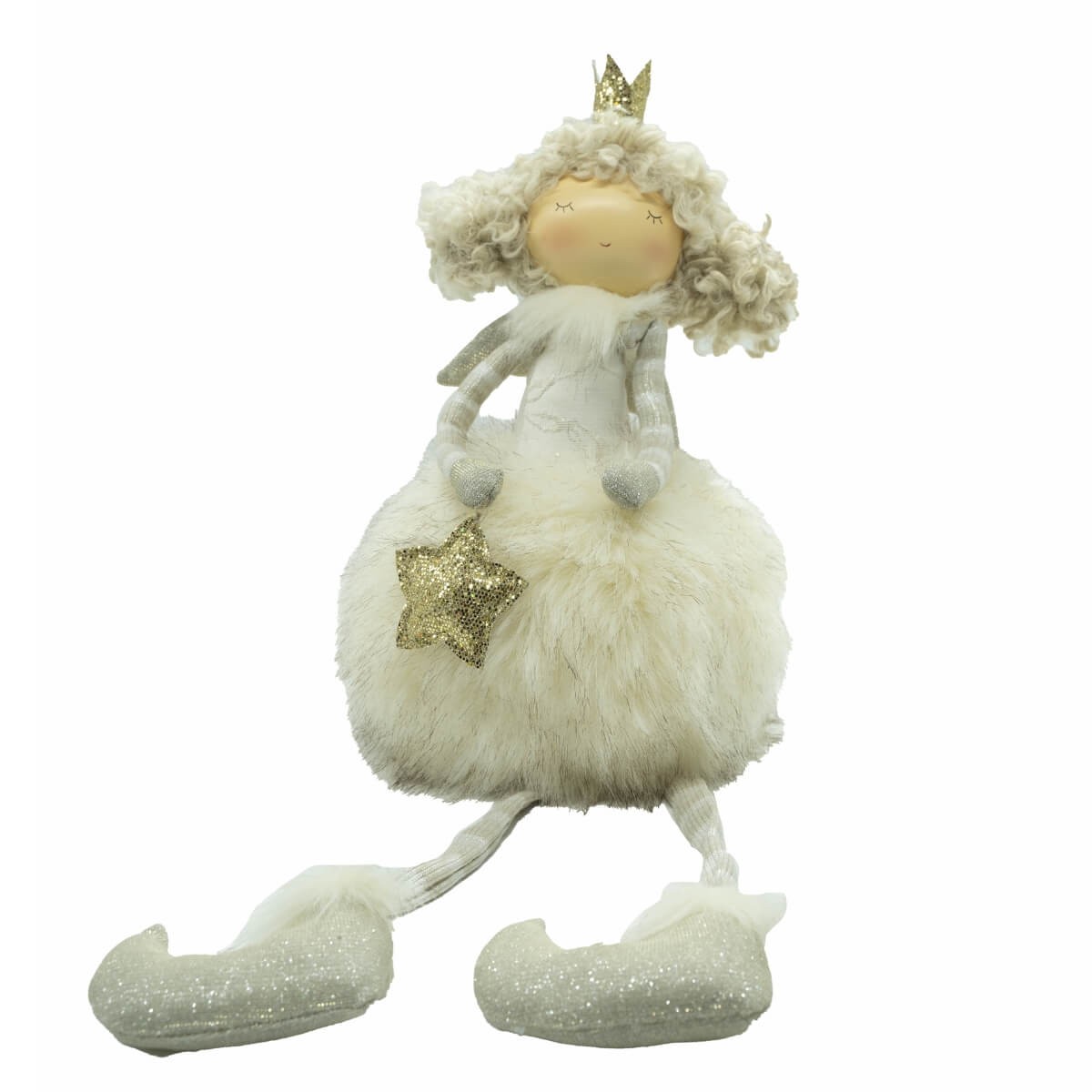 Aggiungi un tocco regale alle tue decorazioni natalizie con questa splendida principessa bianca seduta, alta 53 cm, vestita in un abito soffice e luminoso. Elegante e sognante, tiene in mano una stella dorata glitterata e indossa una coroncina oro, simbolo di magia e raffinatezza.