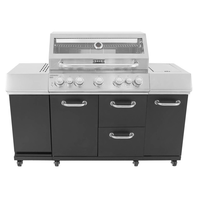 Potenza, eleganza e funzionalità professionale si fondono nel barbecue a gas Stilé “Lussemburgo Black”, un modello d’alta gamma progettato per trasformare ogni grigliata in un’esperienza gourmet. Dotato di cinque bruciatori in acciaio inox da 3.5 kW, ciascuno protetto da diffusori di calore, questo BBQ assicura prestazioni impeccabili anche nelle cotture più impegnative.