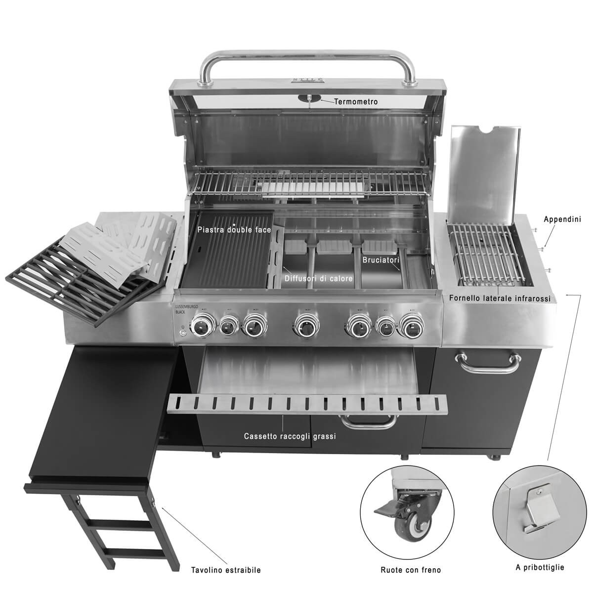 Barbecue a Gas 5 Fuochi con Fornello Laterale e Tavolo Estraibile - Lussemburgo Black