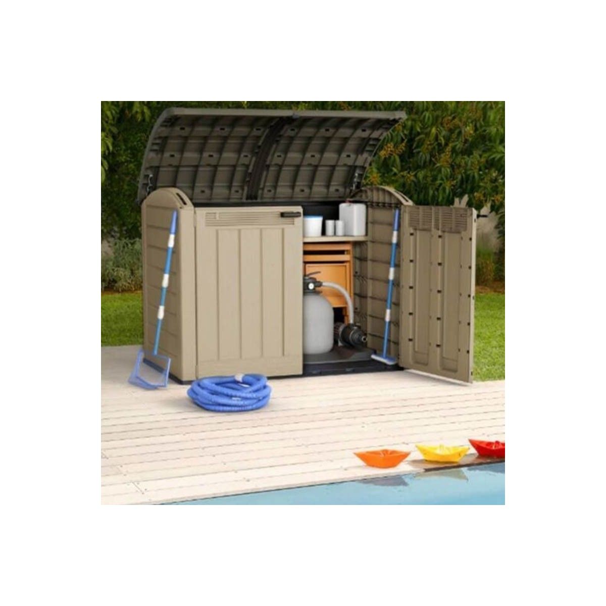 Incredibilmente versatile, lo Store It Out Ultra, è un pratico baule con una capienza di 2000 l, inseribile in qualsiasi spazio esterno. Ciò permette di riporre al suo interno qualsiasi oggetto, da due pattumiere da 360 l a mobili per barbecue, arredamento da giardino, biciclette e pompe da piscina. Dotato di una struttura robusta e resistente alle intemperie custodisce gli oggetti mantenendoli ventilati e asciutti, mentre la soglia inclinata facilita il trasporto degli oggetti dentro e fuori da esso. Facile da montare, chiudibile con lucchetto.