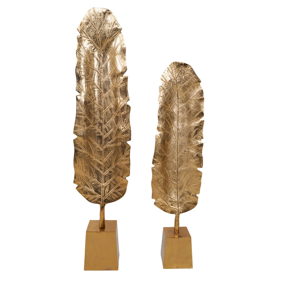 Realizzata in alluminio dorato, ogni foglia è lavorata con dettagli realistici e una finitura lucida che riflette la luce con eleganza. Il basamento geometrico, stabile e proporzionato, permette una facile collocazione a terra, rendendo la decorazione ideale anche per ambienti professionali, vetrine e allestimenti scenografici.