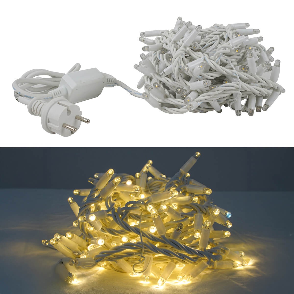 Catena luminosa natalizia 10 metri con 150 LED bianco naturale di cui 15 flash e cavo bianco – IP67 prolungabile