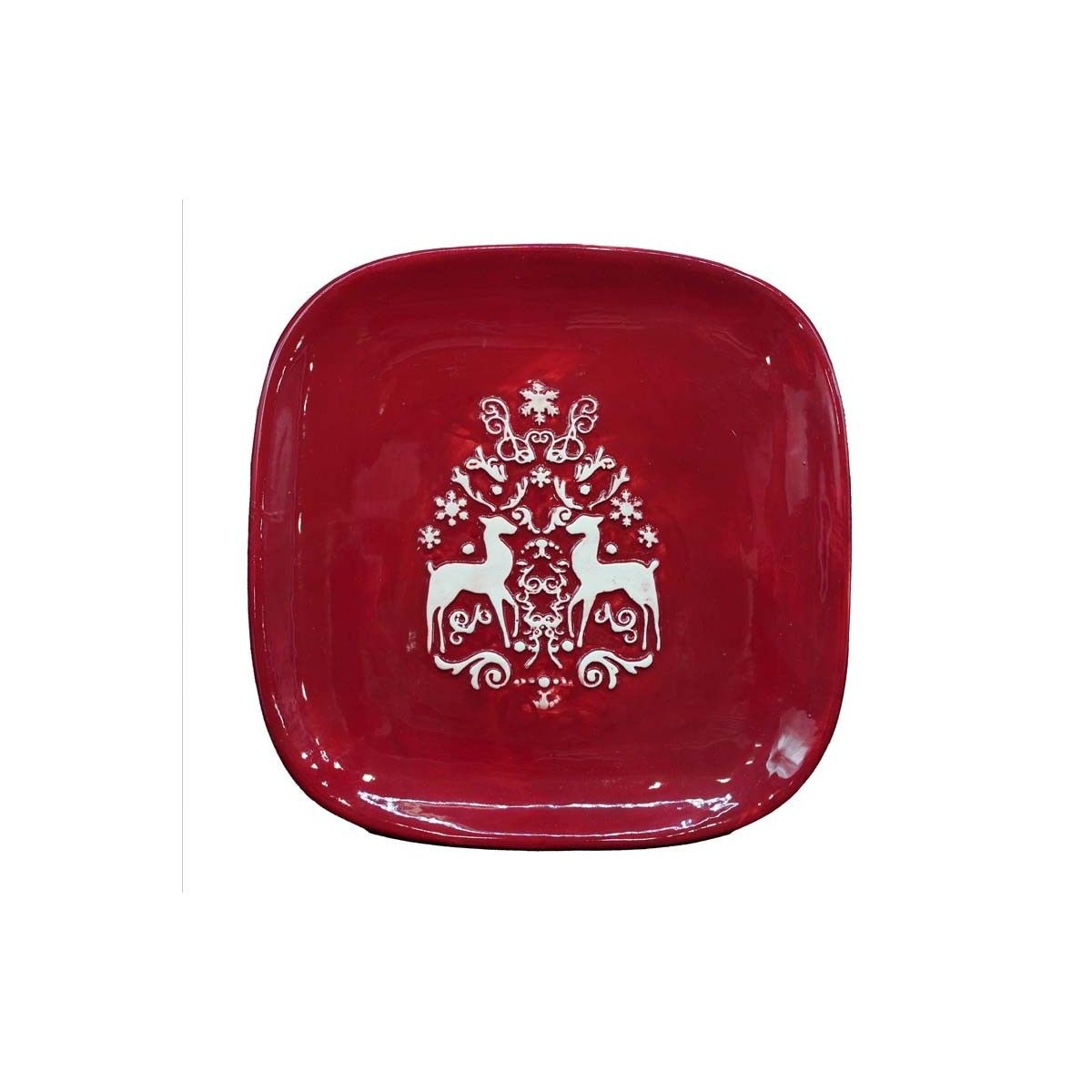 - Piatto quadrato rosso con raffigurate due renne bianche