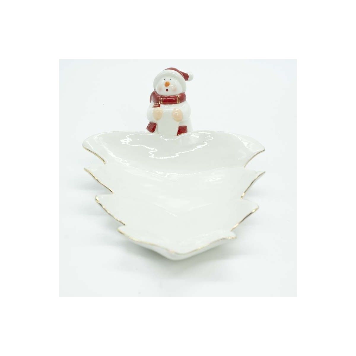 - Piatto in ceramica a forma di albero di Natale con pupazzo di neve