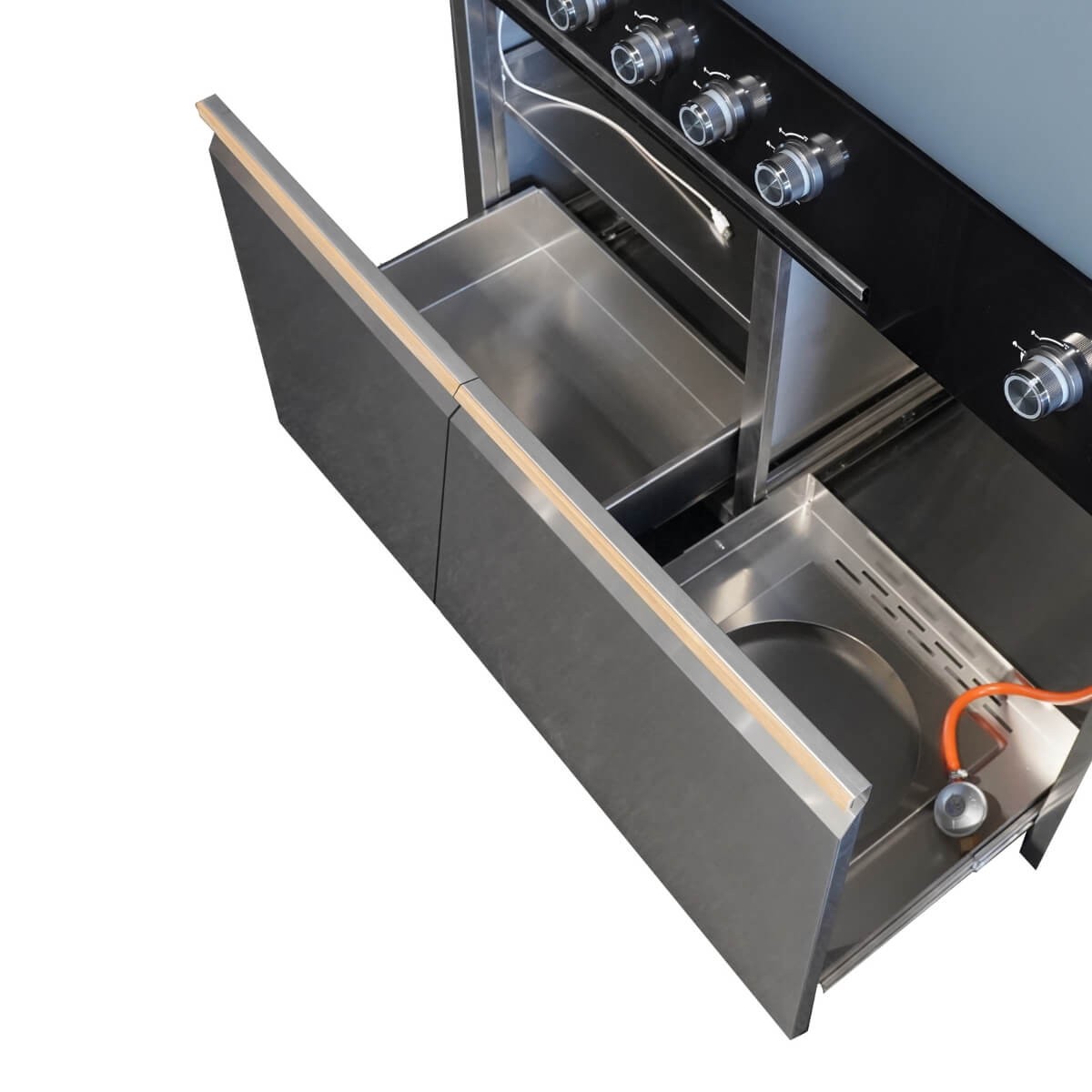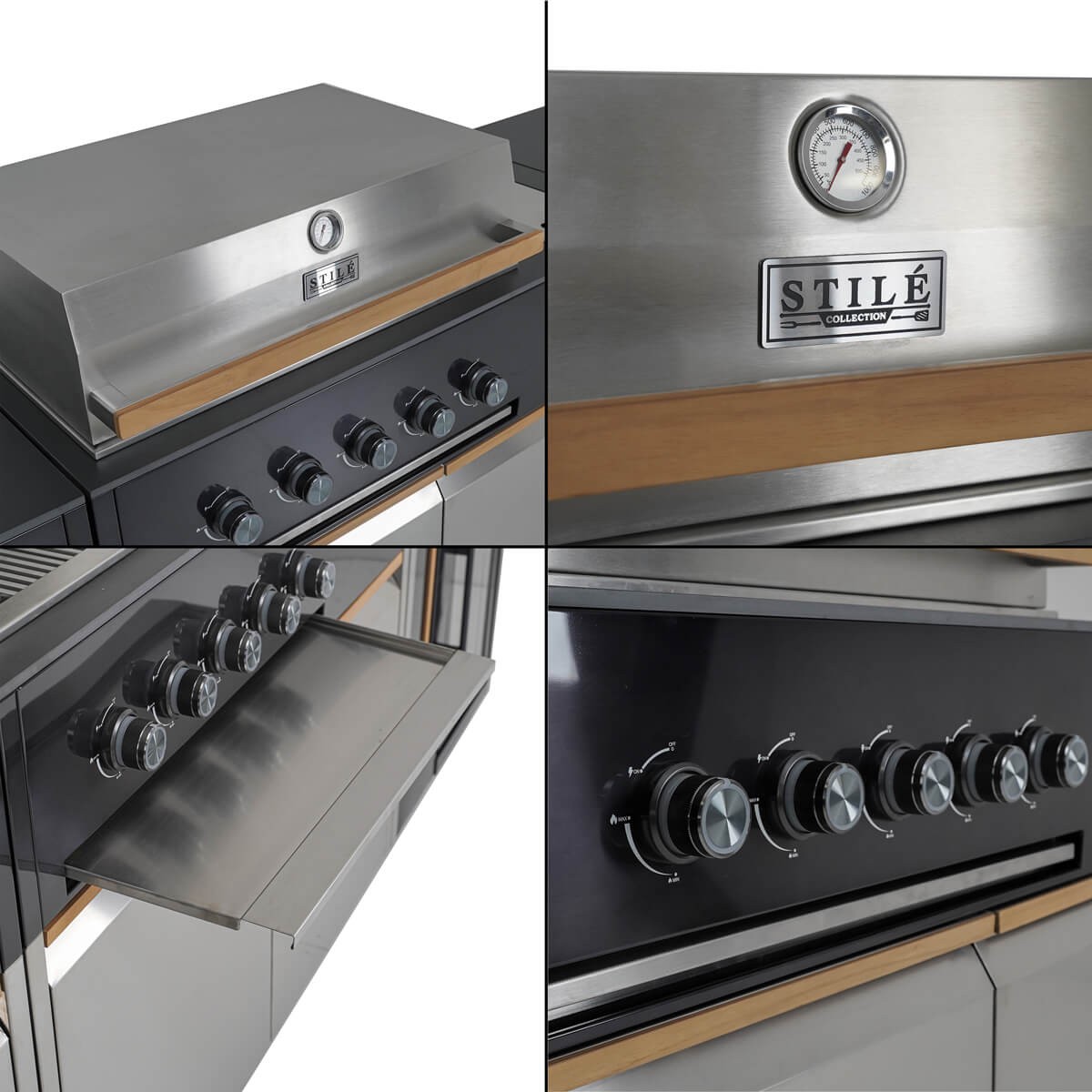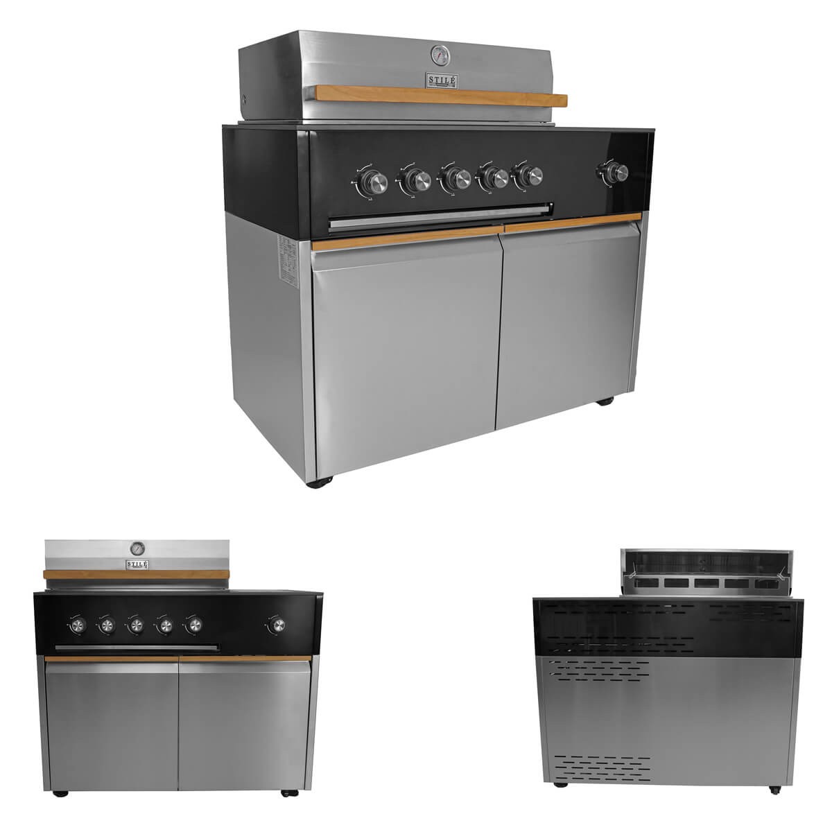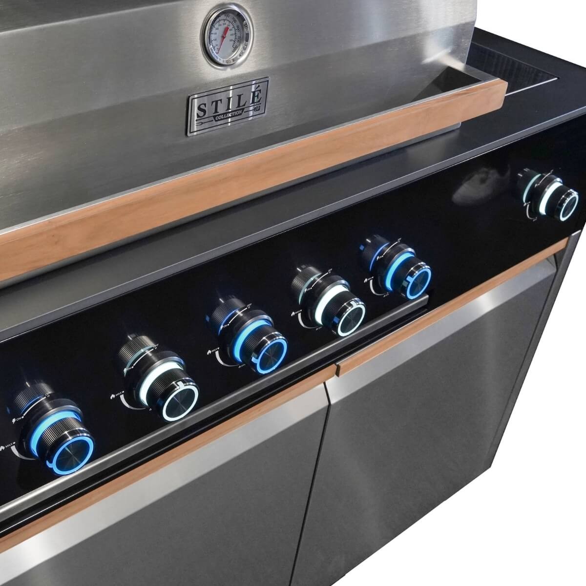 Il modulo barbecue è alimentato a gas GPL e include cinque bruciatori da 3,5 kW e un fornello laterale a infrarossi da 3 kW, per una potenza complessiva di 20,5 kW. La cappa con termometro, le griglie e la piastra in acciaio e ghisa, il cassetto raccogli grassi, e i pomelli LED retroilluminati garantiscono prestazioni elevate con un design professionale.