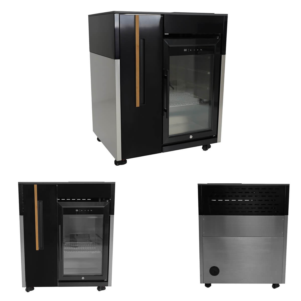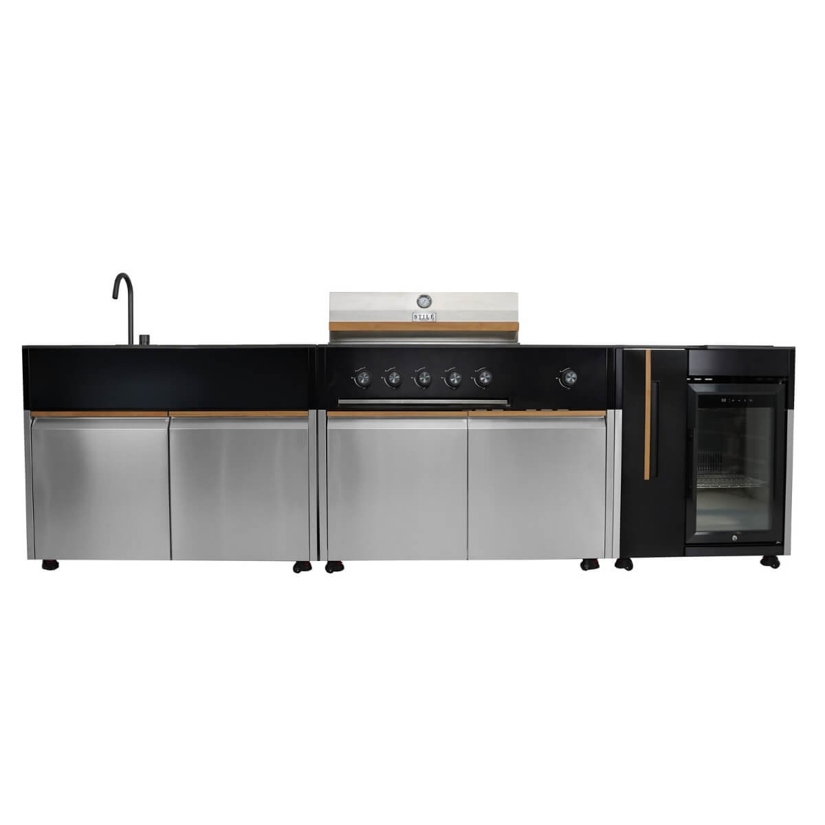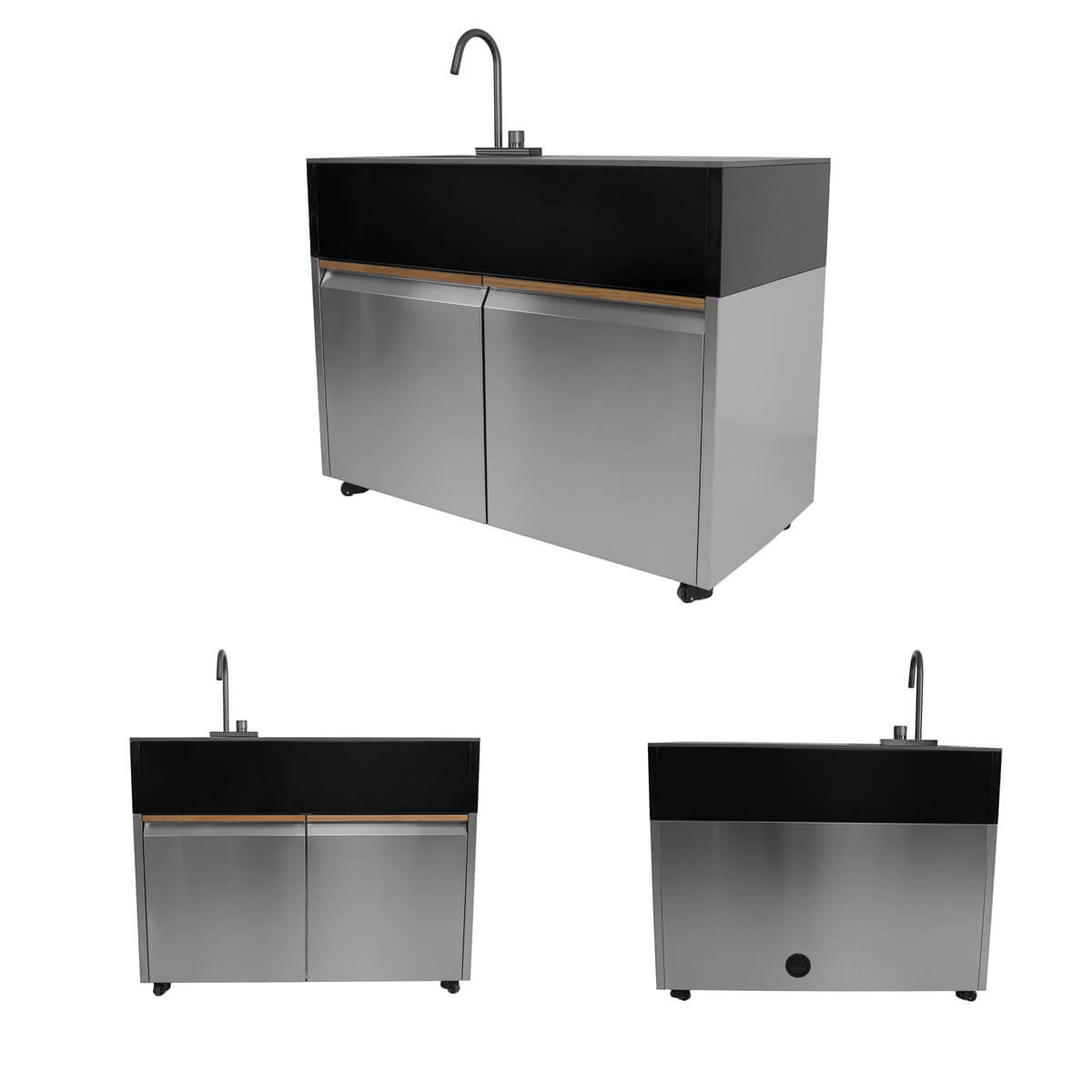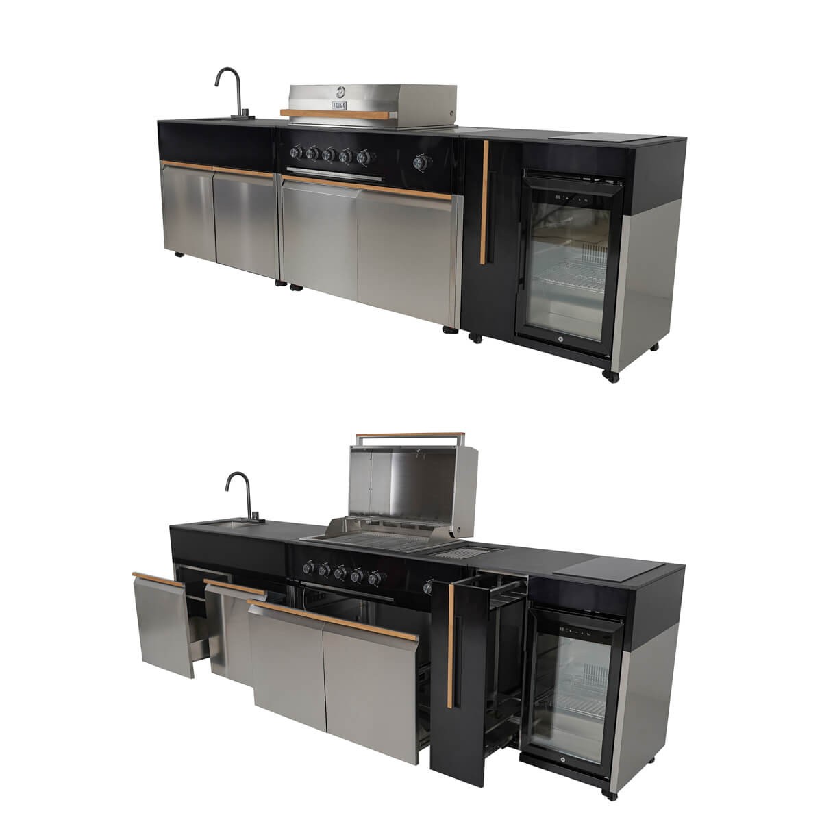 Con una struttura in acciaio inox 304, piano di lavoro in pietra sinterizzata e rivestimenti in teak naturale, ogni dettaglio è stato studiato per garantire durabilità, resistenza agli agenti atmosferici e un impatto estetico di alto livello.