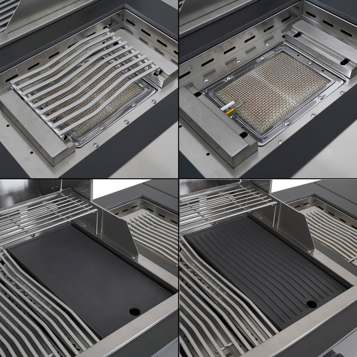 - Griglie in acciaio inox 304 e piastra in ghisa double-face (liscia/rigata)