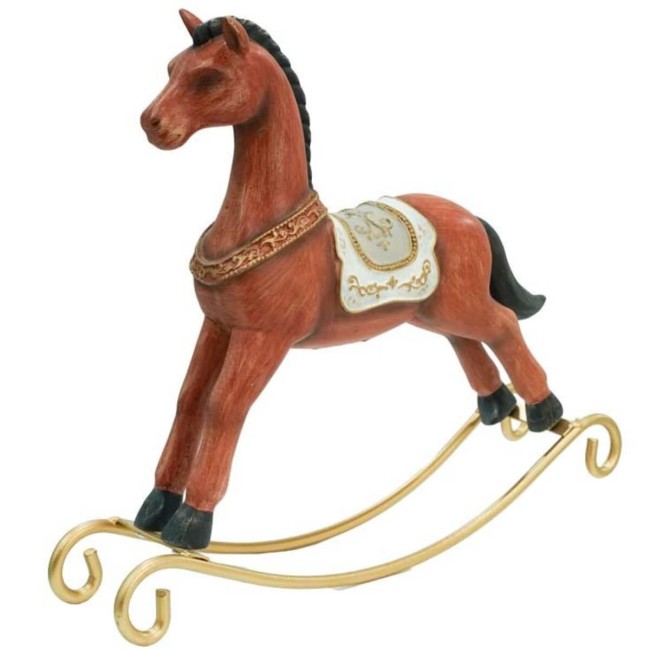 Realizzato in poliresina di alta qualità, questo cavallo a dondolo si distingue per l’elevata cura dei dettagli e per la finitura sofisticata. Il cavallo marrone è valorizzato da un dondolo color oro, che dona luminosità e un tocco di prestigio all’intera decorazione.