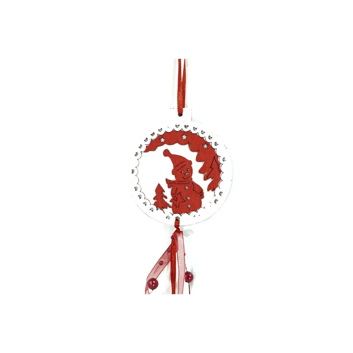 Pendente Natalizio in Legno con Pupazzo di Neve Bianco e Rosso D.7 cm