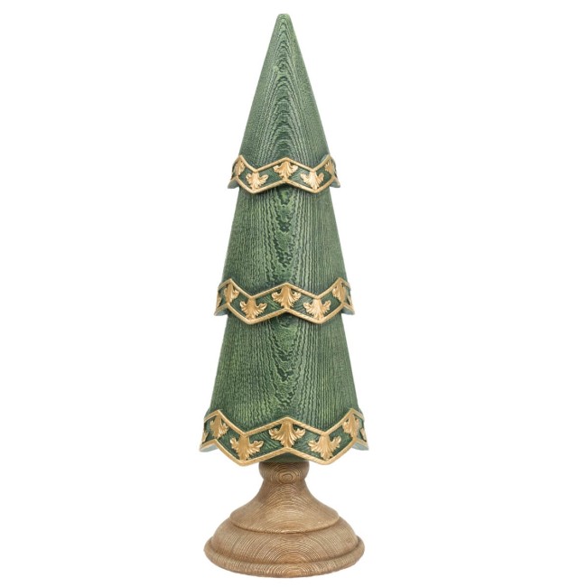 Porta un tocco di raffinatezza alle tue decorazioni natalizie con questo elegante alberello di Natale. Realizzato in poliresina di alta qualità, presenta un design slanciato color verde scuro con dettagli in oro che valorizzano ogni ambiente, dal salotto alla vetrina di un negozio. La base finemente lavorata e gli inserti dorati conferiscono un aspetto classico e sontuoso, ideale per uno stile natalizio tradizionale ma ricercato.