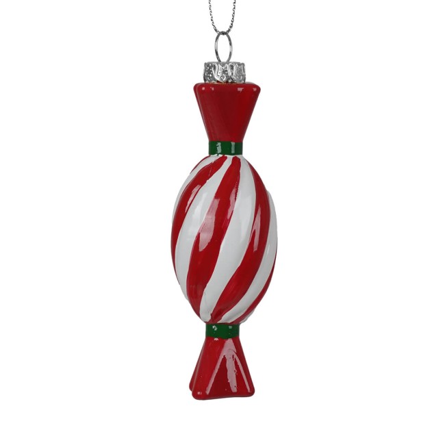 Il suo design, ispirato alle classiche caramelle natalizie, presenta una superficie lucida a strisce rosse e bianche con eleganti dettagli verdi che donano vivacità e brillantezza. Le dimensioni compatte di 3,5x3,5xH.10,5 cm la rendono ideale per essere combinata con altri addobbi, creando un effetto scenografico armonioso e festoso.