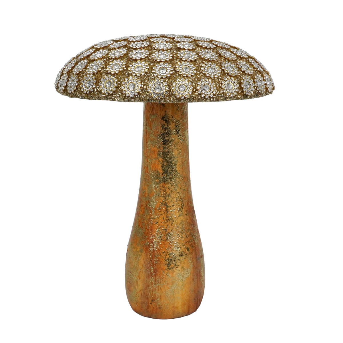 Realizzato con cura, questo fungo decorativo si distingue per il cappello tempestato di strass luminosi disposti a motivo floreale, che riflettono la luce creando un effetto brillante e sofisticato. La base, dal diametro di 5 cm, si innalza con un gambo slanciato che culmina in un’ampia testa di 16,5 cm di diametro, per un’altezza complessiva di 20,5 cm.