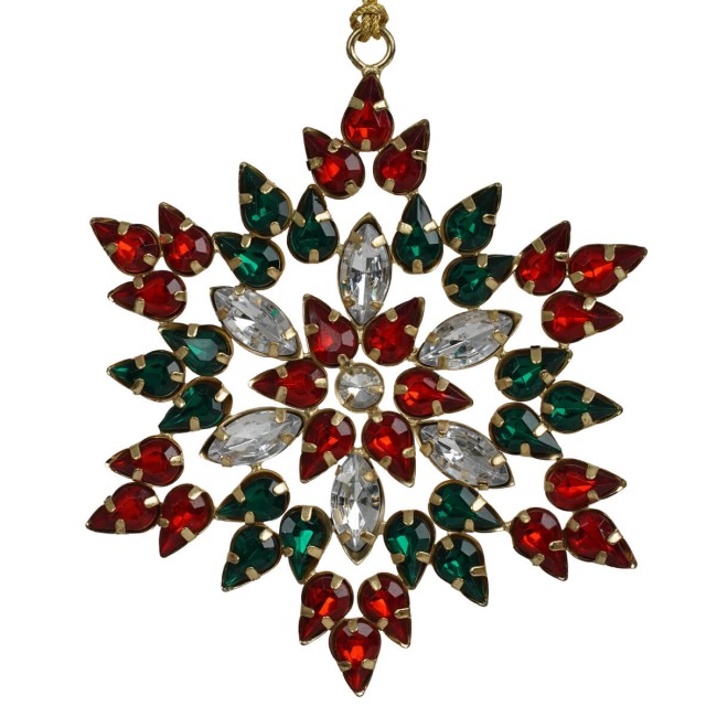 - Fiocco di neve natalizio da appendere impreziosito da gemme colorate, perfetto per aggiungere un tocco luminoso e raffinato alle decorazioni