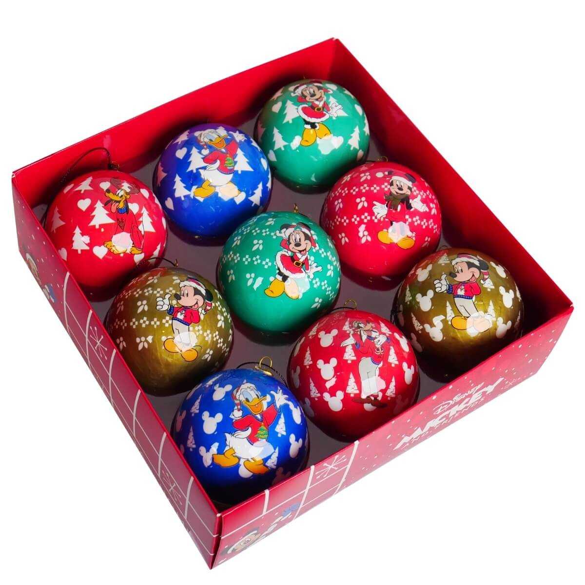 - Tema Disney Classico: Set di 9 palline natalizie con Topolino, Minnie, Paperino e Pippo, perfetto per portare la magia Disney direttamente nel tuo albero di Natale.