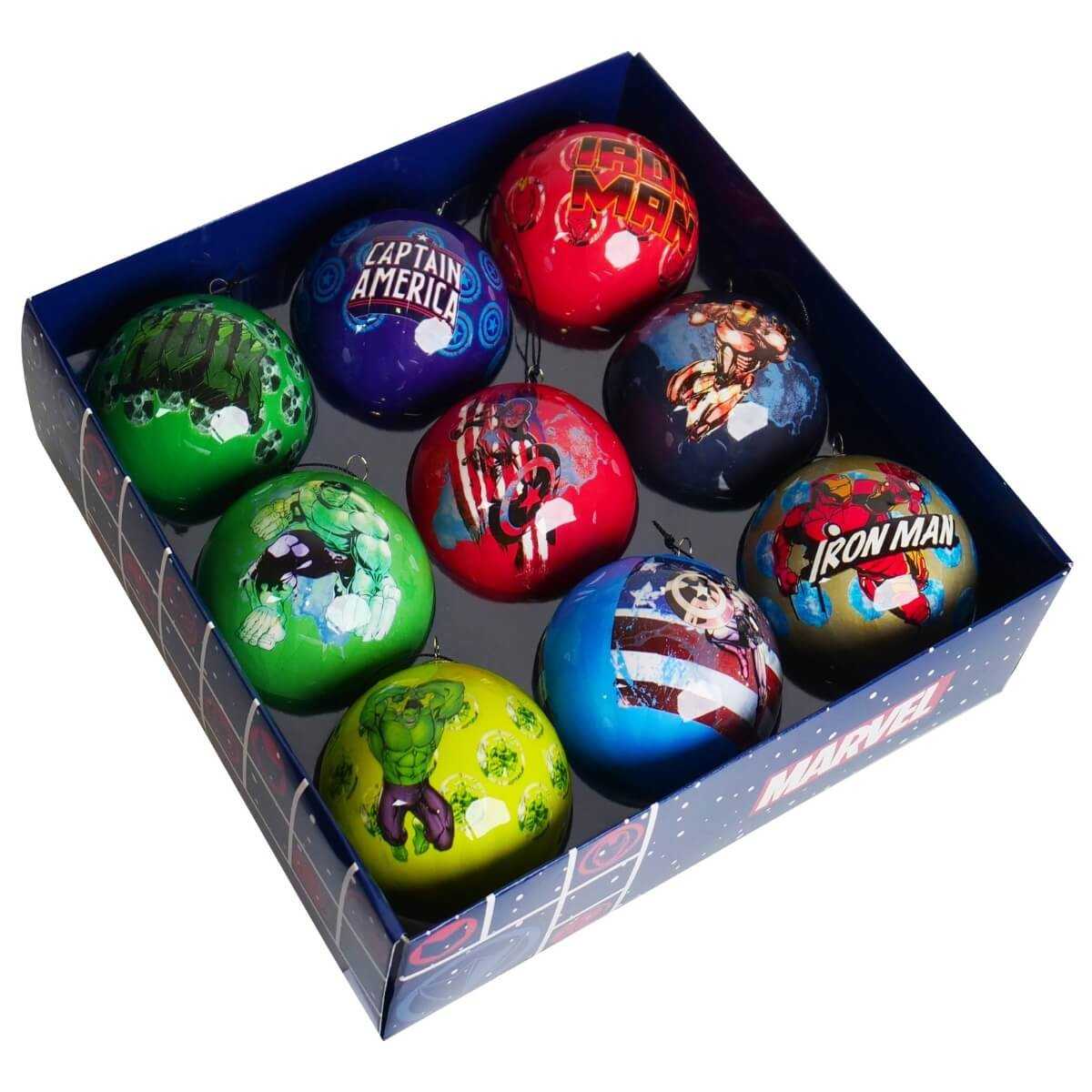 - Tema Marvel Avengers: Set di 9 palline natalizie con i supereroi Marvel, tra cui Iron Man, Hulk, Captain America e altri protagonisti iconici, perfetto per un Natale ricco di avventura.