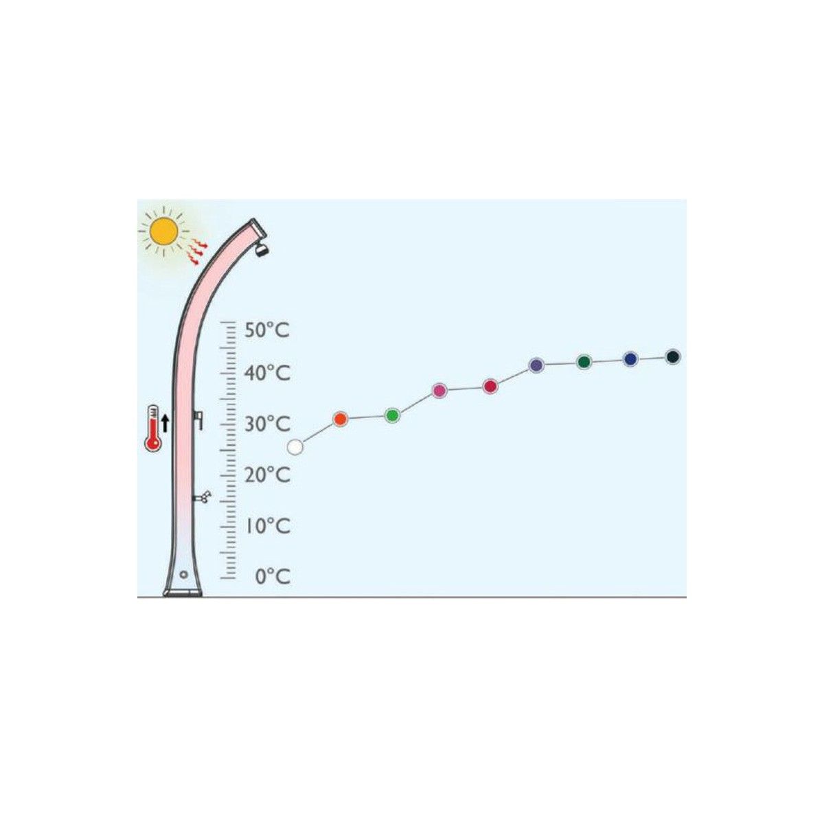 La doccia a riscaldamento solare Happy di Arkema ha un design elegante ed è realizzata in polietilene HD resistente ai raggi UV ed al calcare. Fornisce acqua calda riscaldata dai raggi solare senza nessun consumo di elettricità, grazie al miscelatore potrete regolare la temperatura desiderata. Perfetta sia da tenere in giardino per uso privato sia in uno stabilimento balneare pubblico.