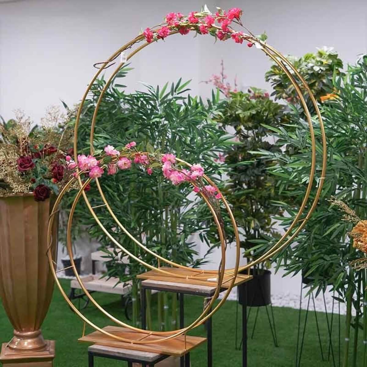 Questo set comprende 2 strutture multifunzionali da appoggio. Realizzati in metallo color oro; sono perfetti per realizzare composizioni particolari con fiori e piante o altri materiali, in modo da rendere unico il tuo evento!