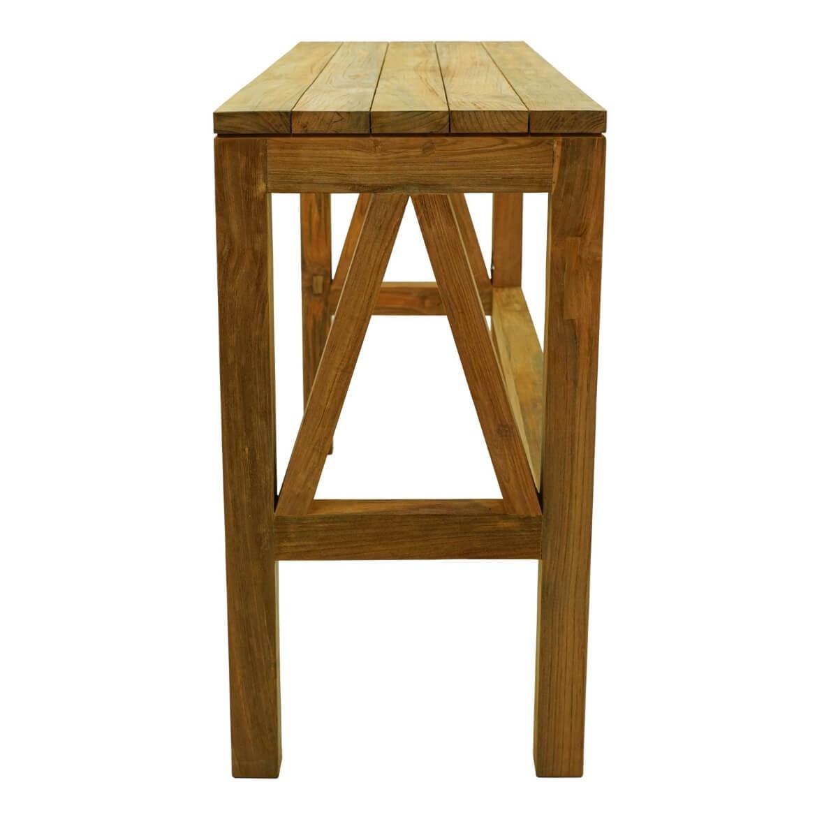 Il teak, rinomato per la sua resistenza agli agenti atmosferici e alla corrosione, rende questa console ideale per l'uso all'aperto, mentre il suo design essenziale si adatta perfettamente agli ambienti interni, aggiungendo un tocco di classe e funzionalità ovunque tu decida di posizionarla.
