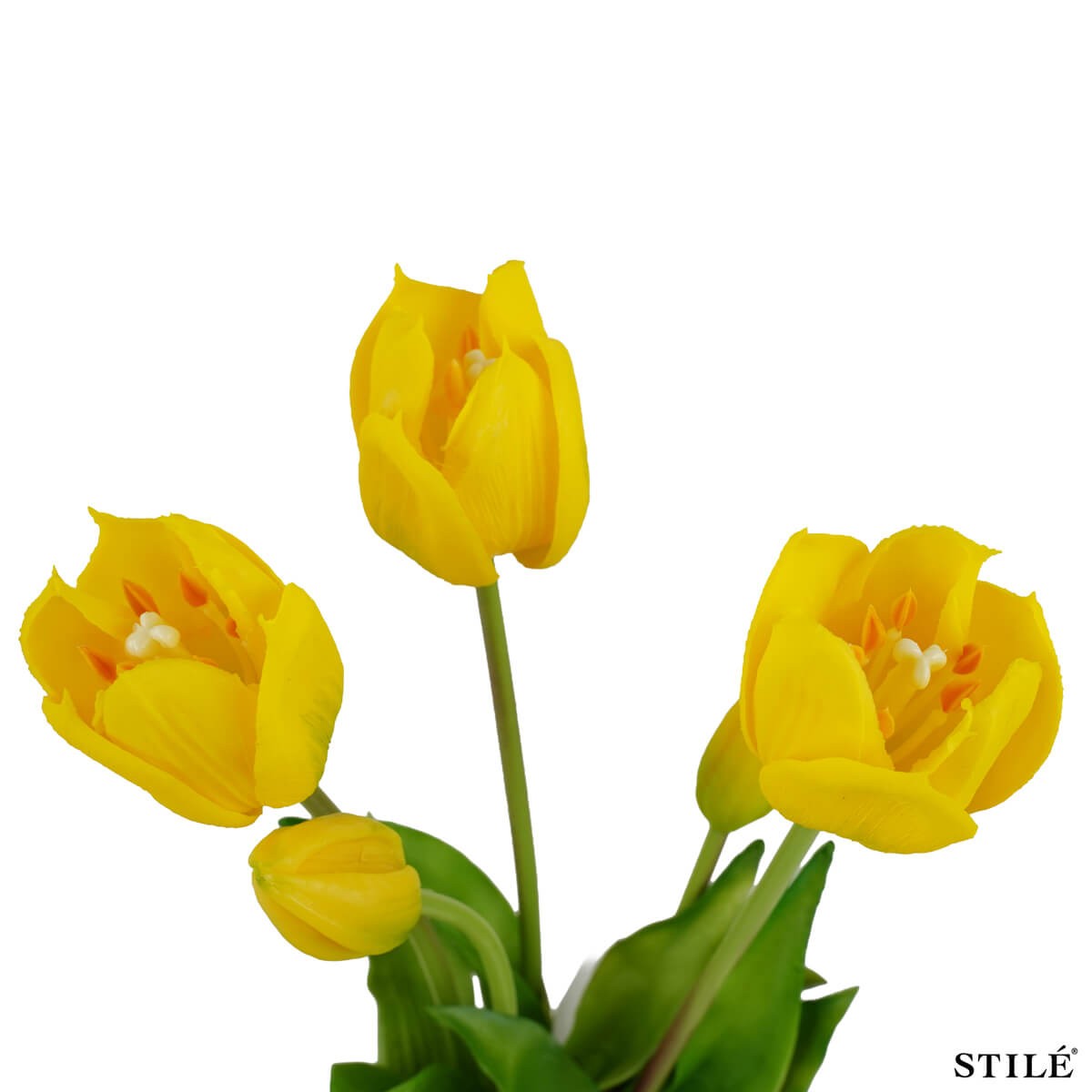 Il fascio è composto da 3 tulipani aperti e 2 boccioli chiusi, una combinazione studiata per dare movimento e naturalezza a composizioni floreali, centrotavola, vasi decorativi o allestimenti per eventi e vetrine. Con un’altezza di 38 cm, si adatta perfettamente a diversi stili di arredamento, dal moderno al classico.