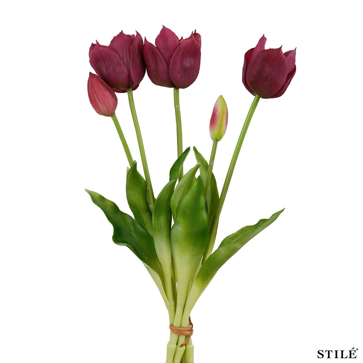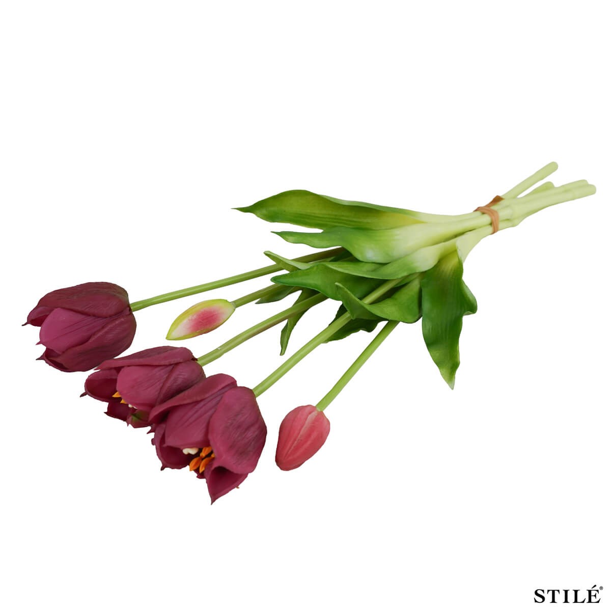 Il fascio è composto da 3 tulipani aperti e 2 boccioli chiusi, una combinazione studiata per dare movimento e naturalezza a composizioni floreali, centrotavola, vasi decorativi o allestimenti per eventi e vetrine. Con un’altezza di 38 cm, si adatta perfettamente a diversi stili di arredamento, dal moderno al classico.