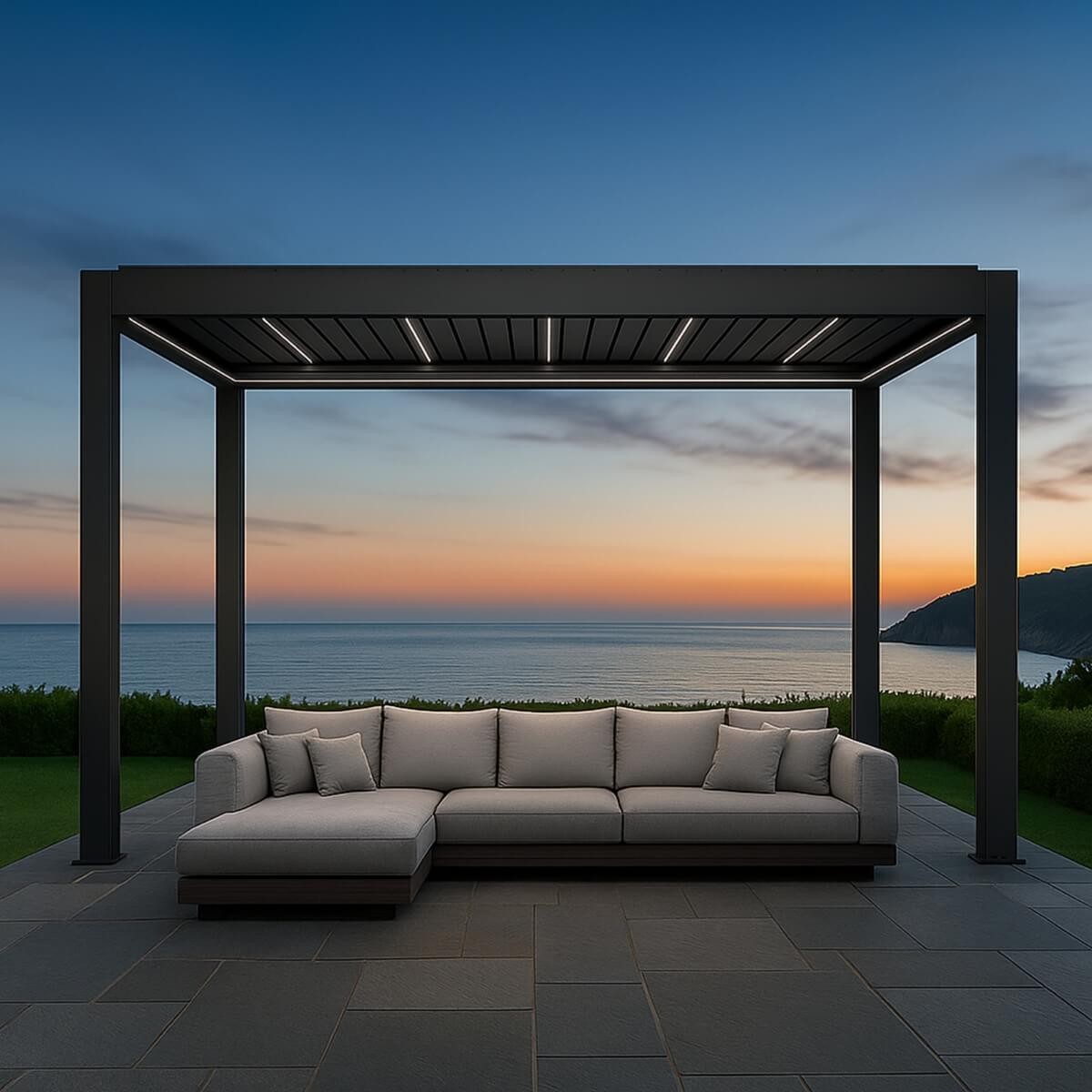 Dotata di 34 lamelle motorizzate orientabili da 0° a 90° con chiusura ermetica, consente una perfetta regolazione di luce, ombra e ventilazione. Il tetto si aziona tramite telecomando o centralina inclusa, rendendo l’utilizzo semplice e immediato. In più, grazie al sistema di illuminazione LED integrato, puoi vivere lo spazio anche di sera in totale comfort.