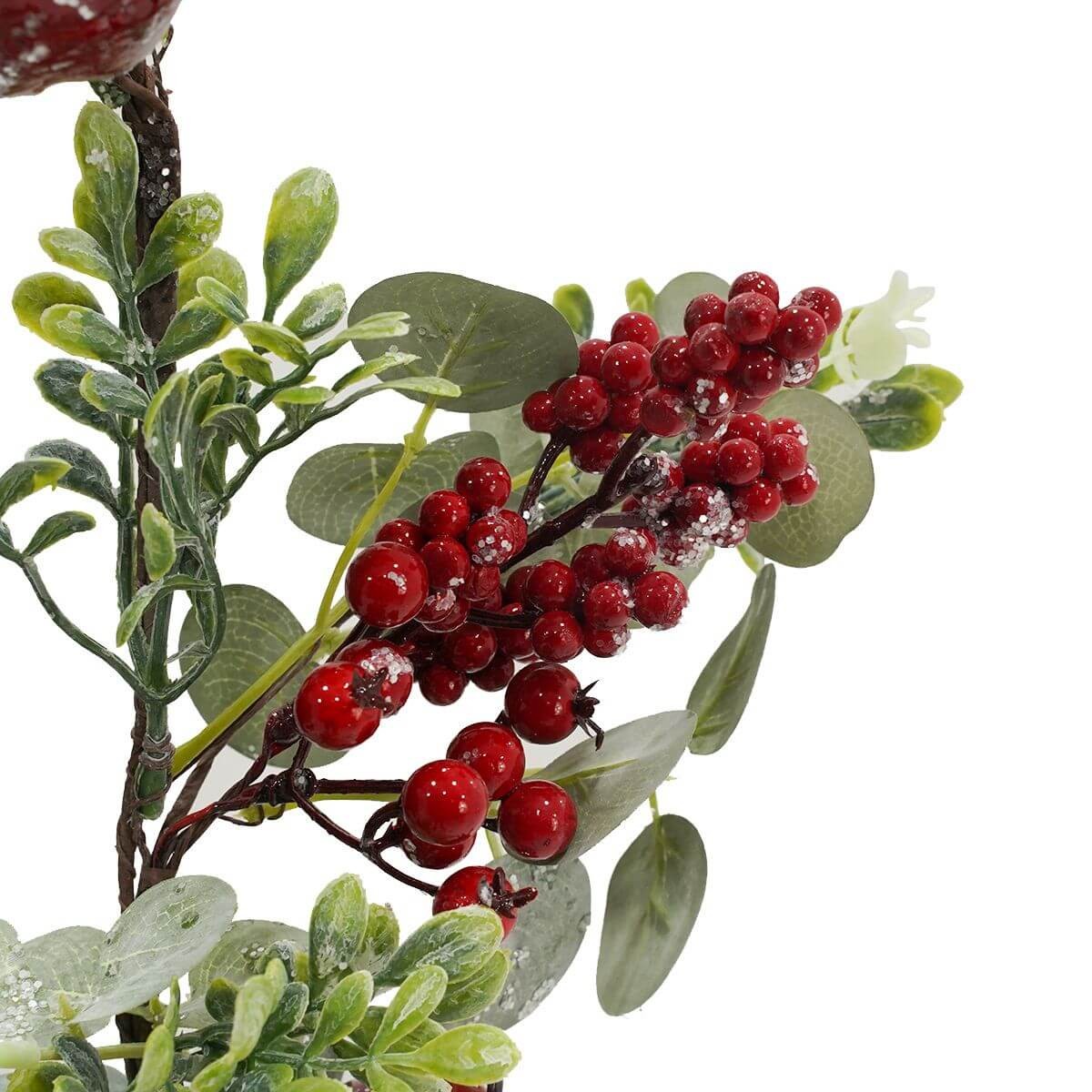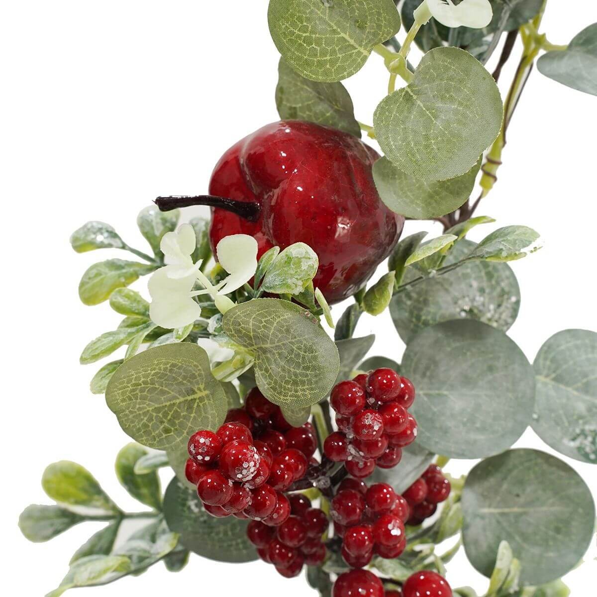 - Composizione ricca: foglie verdi, bacche rosse e mele decorative