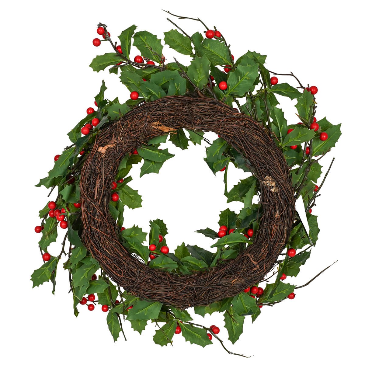 Ghirlanda Natalizia con Foglie Verdi e Bacche Rosso Scuro D.30 cm in PE – Decorazione Classica per Interni ed Esterni