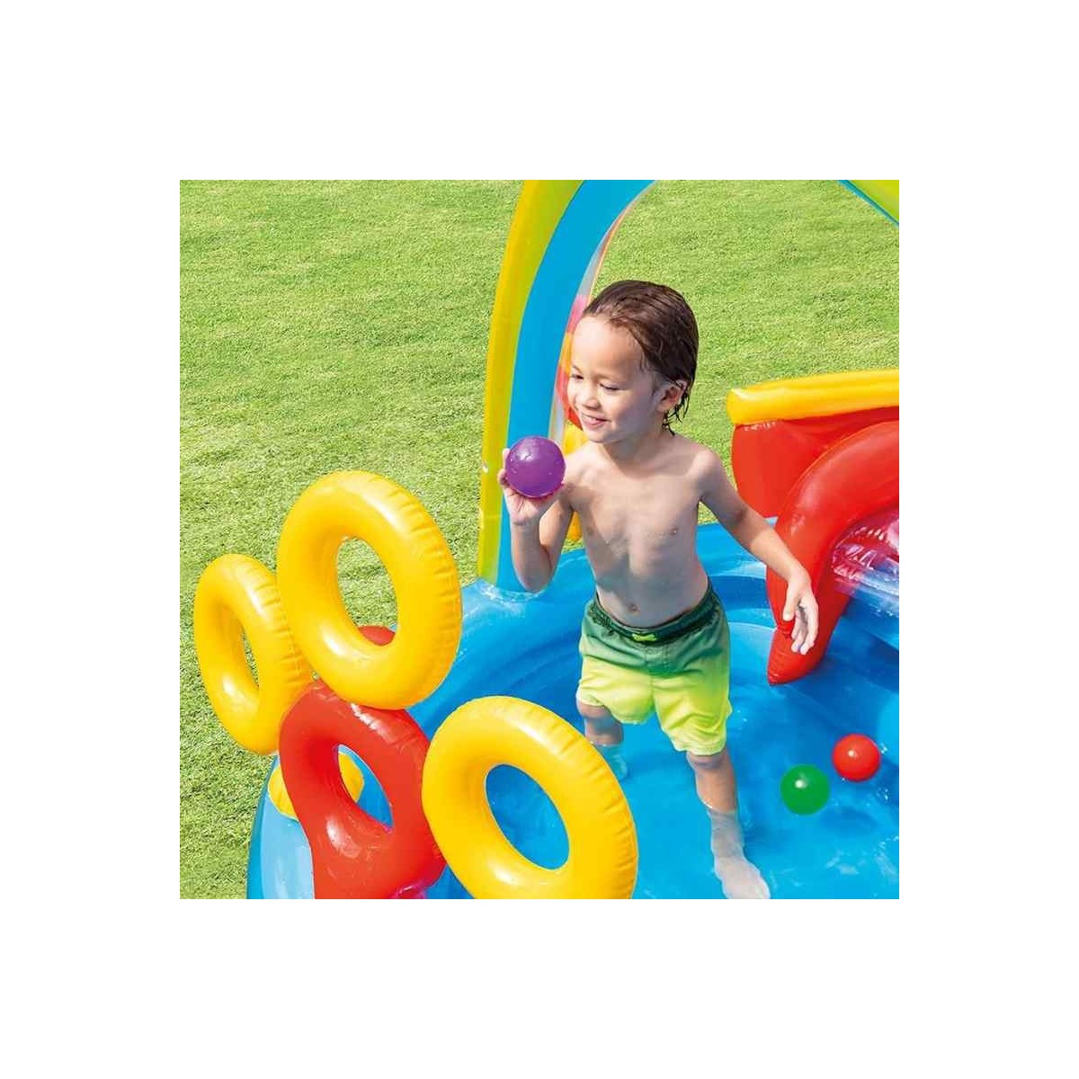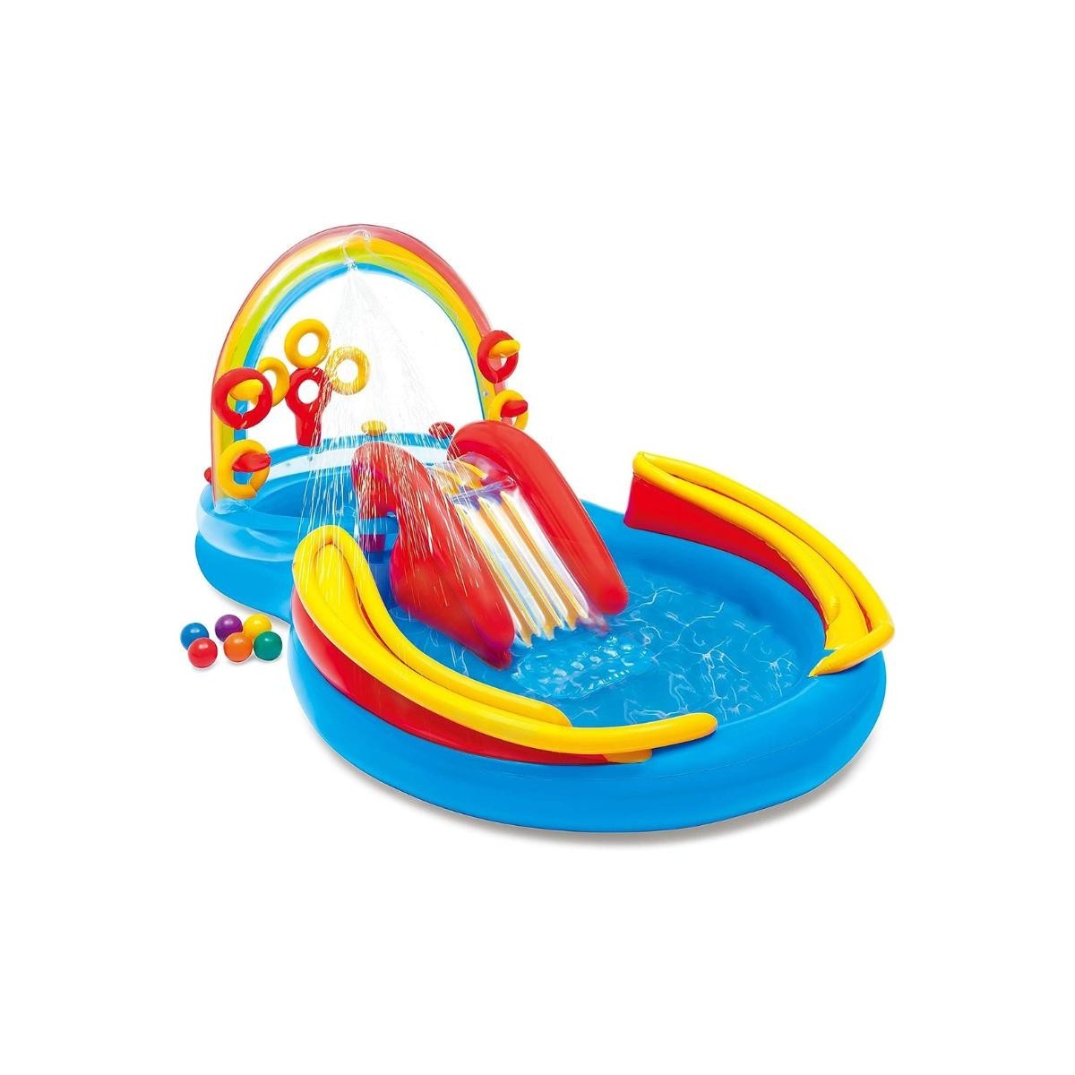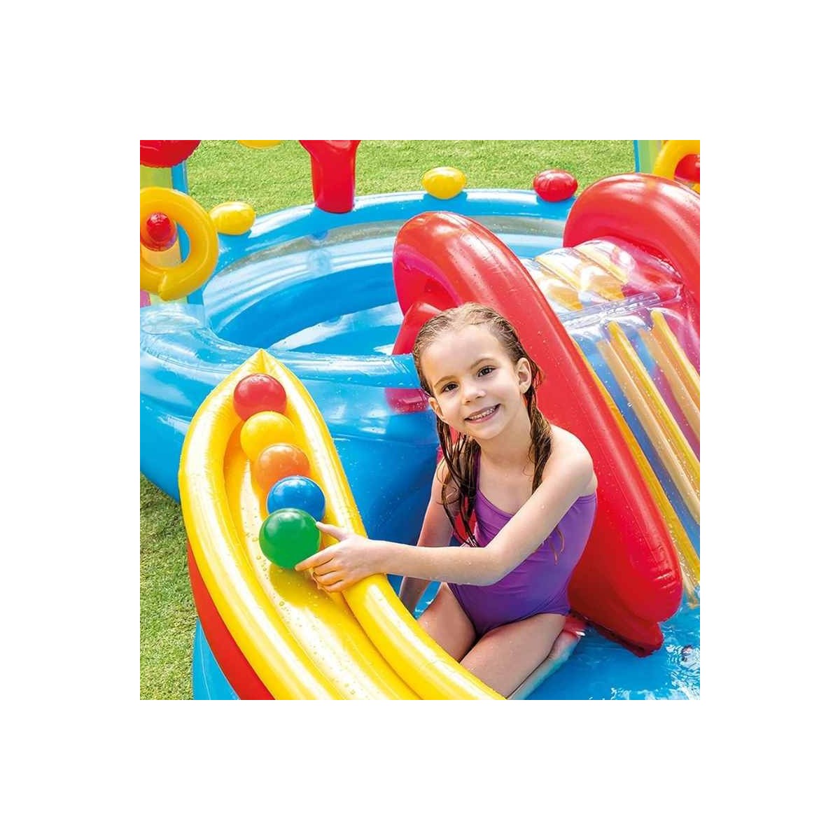 - Include uno scivolo, una piscinetta più piccola, uno spruzzatore, il gioco degli anelli (con 4 anelli gonfiabili), il gioco delle palline (con 6 Fun Ball da 8 cm incluse)
