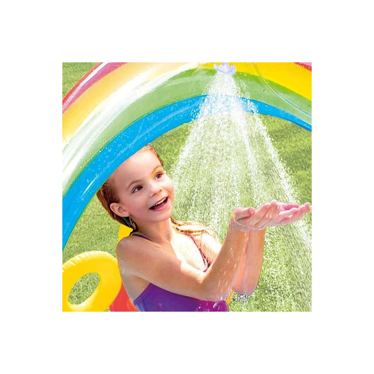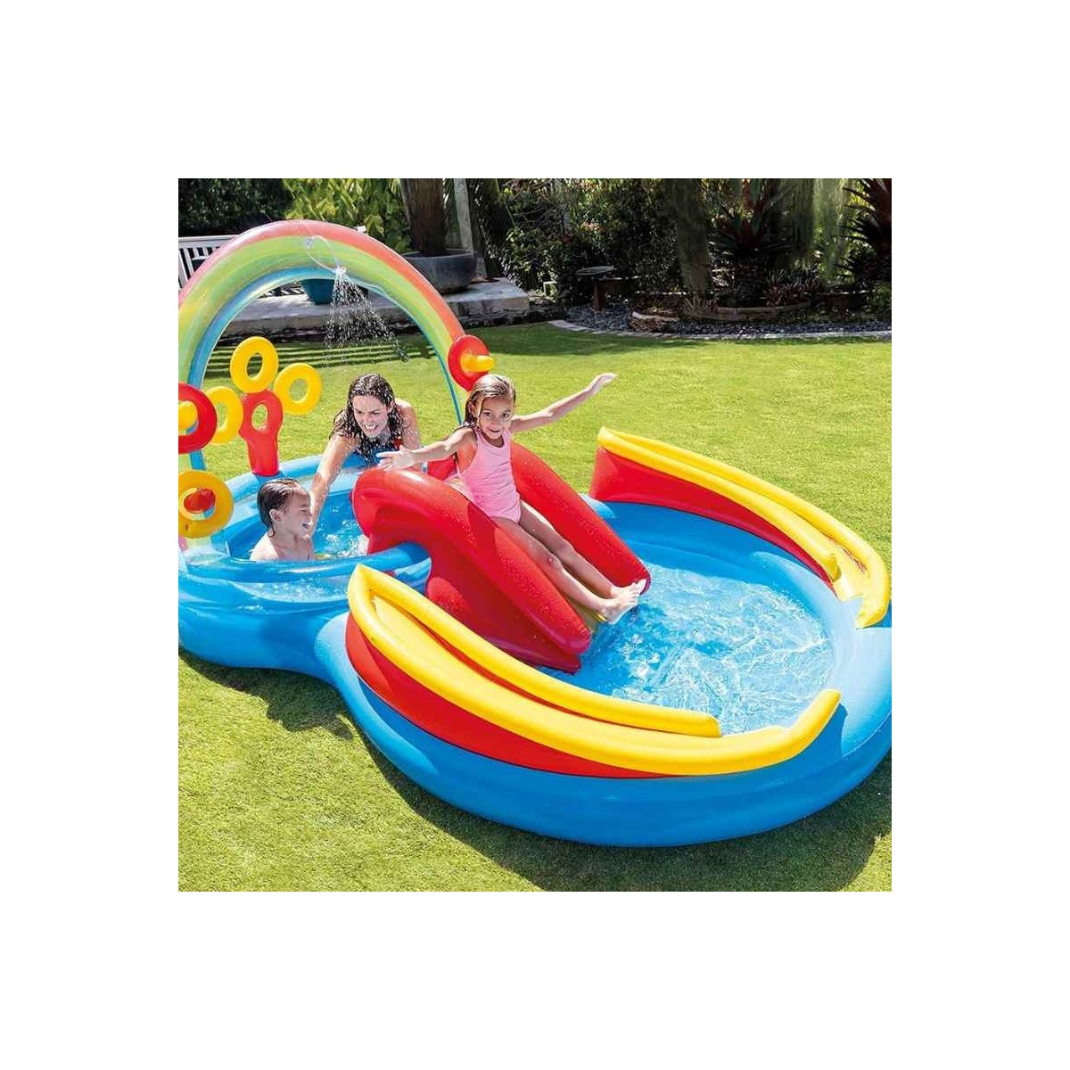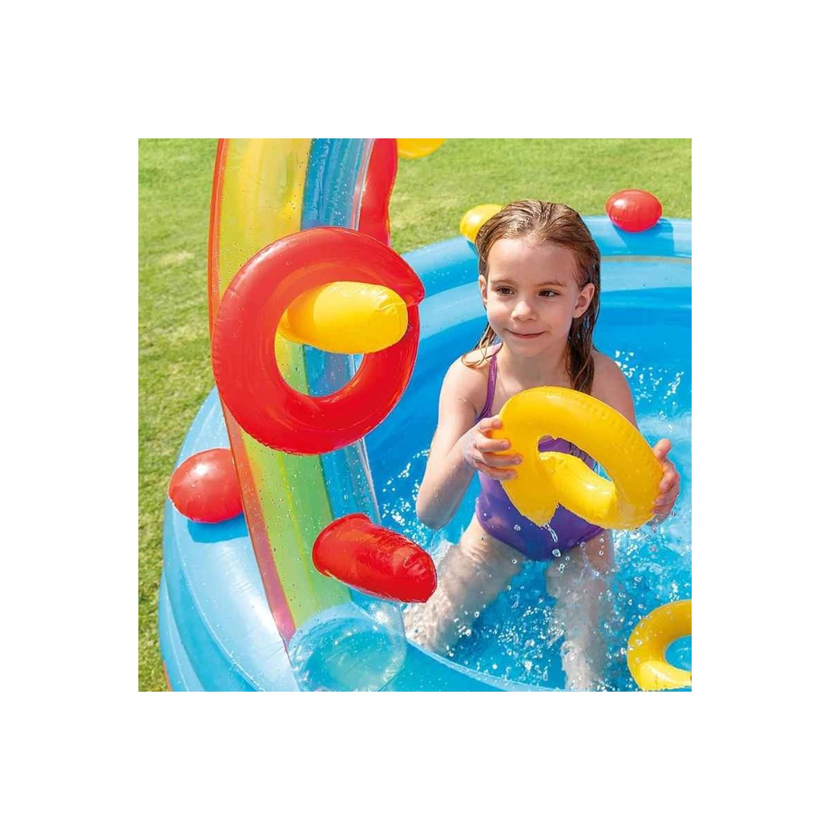 - Include uno scivolo, una piscinetta più piccola, uno spruzzatore, il gioco degli anelli (con 4 anelli gonfiabili), il gioco delle palline (con 6 Fun Ball da 8 cm incluse)