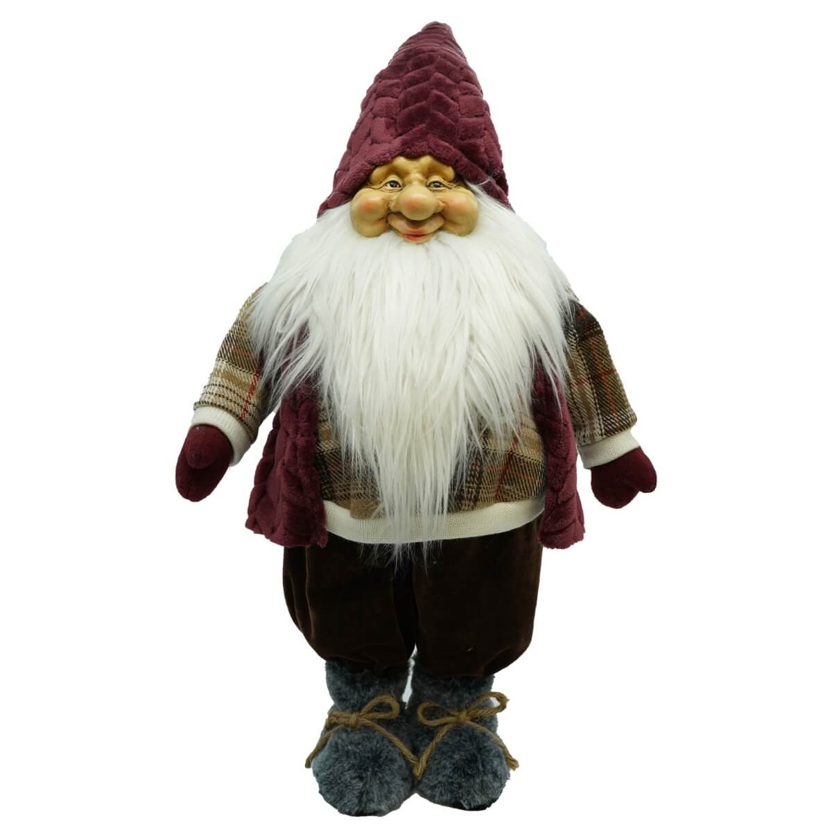 Questo gnomo in versione maxi, alto 86 cm, è realizzato con materiali pregiati: un cappello trapuntato in velluto bordeaux, una lunga barba bianca in pelliccia sintetica e abiti in stile rustico con maglia scozzese, pantaloni in velluto e morbide pantofole. Il volto realistico e sorridente dona personalità a questa figura natalizia, rendendola perfetta per arredare spazi ampi, vetrine, showroom o ingressi.
