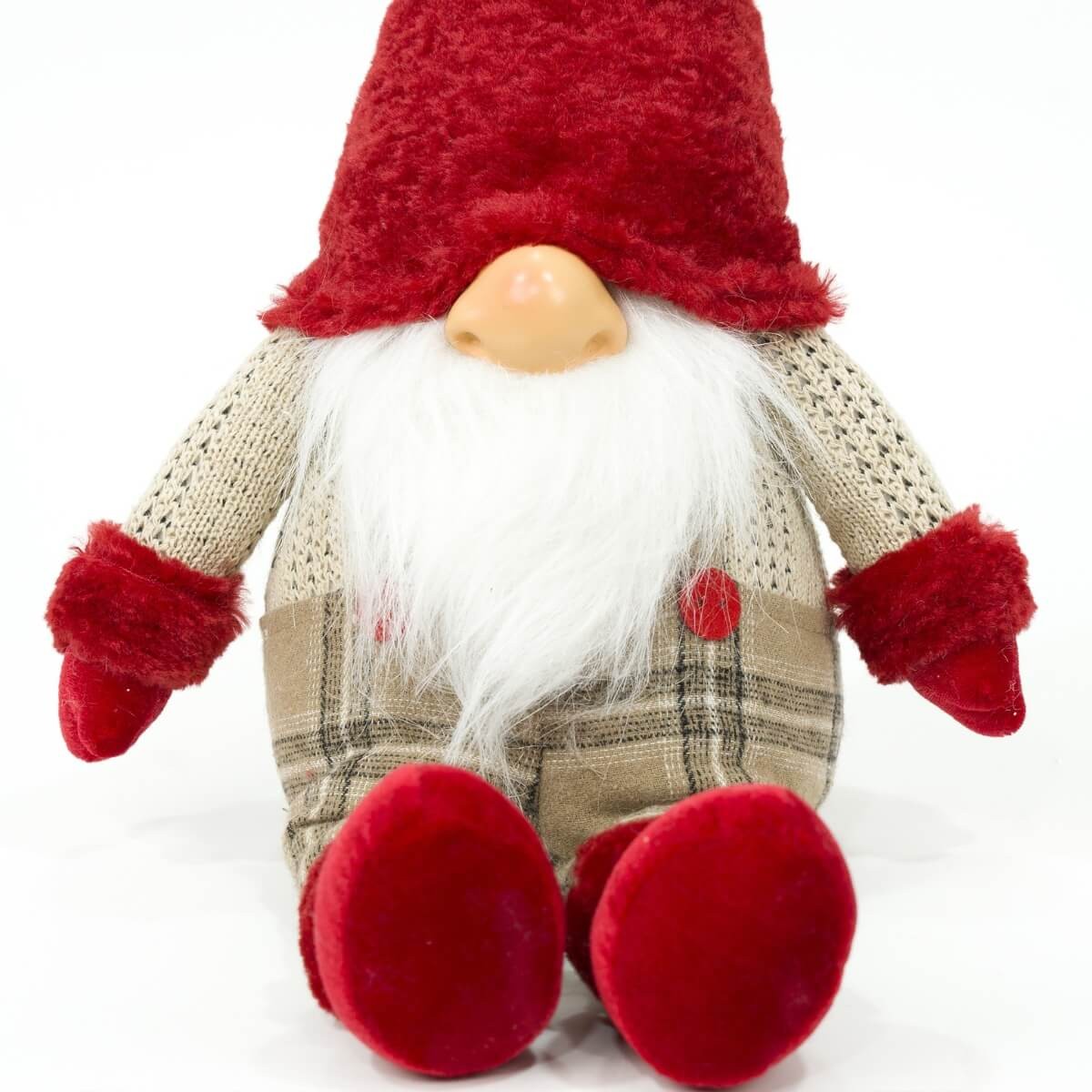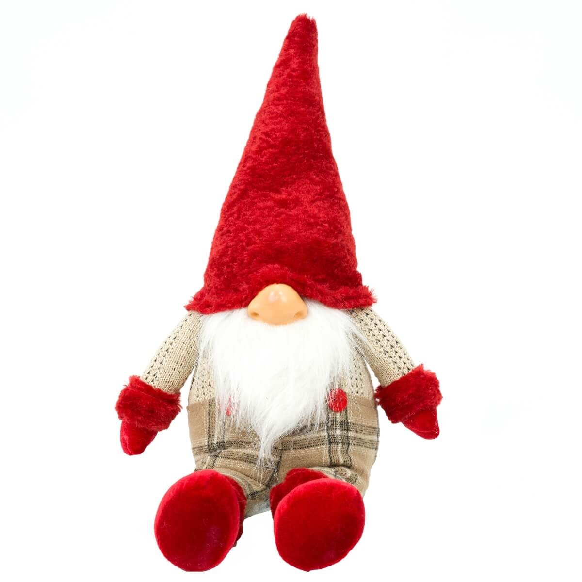 Lo gnomo è vestito con una classica salopette marrone a quadri e un morbido cappello rosso a punta che copre parzialmente il viso, lasciando intravedere solo il tipico nasone e la lunga barba bianca. Grazie alla posizione seduta e alle sue dimensioni di 23 x 13 x H.57 cm, si presta perfettamente per decorare mensole, panche, scale o mobili natalizi, portando un tocco rustico ma curato nei dettagli.