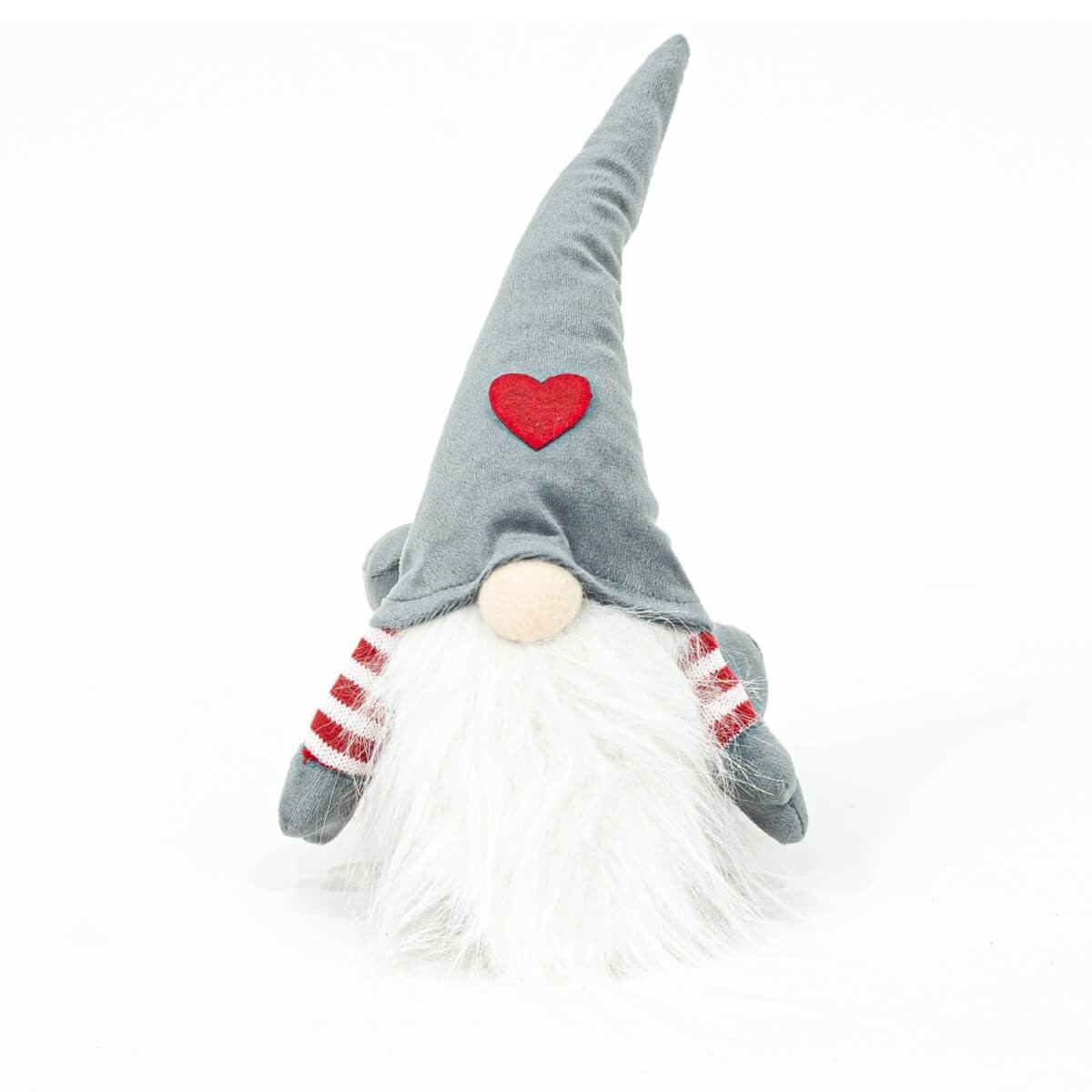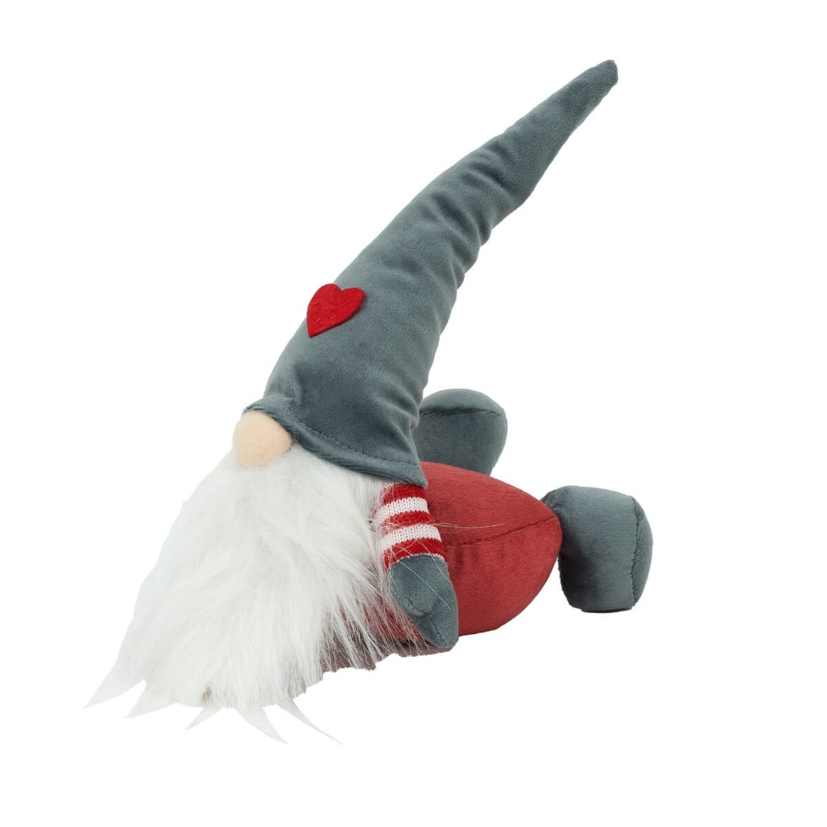 Questo simpatico gnomo natalizio si presenta in posizione sdraiata, con cappello lungo e barba bianca, vestito nei toni eleganti del rosso e grigio. Un piccolo dettaglio a forma di cuore applicato sul cappello aggiunge un tocco affettuoso e distintivo.