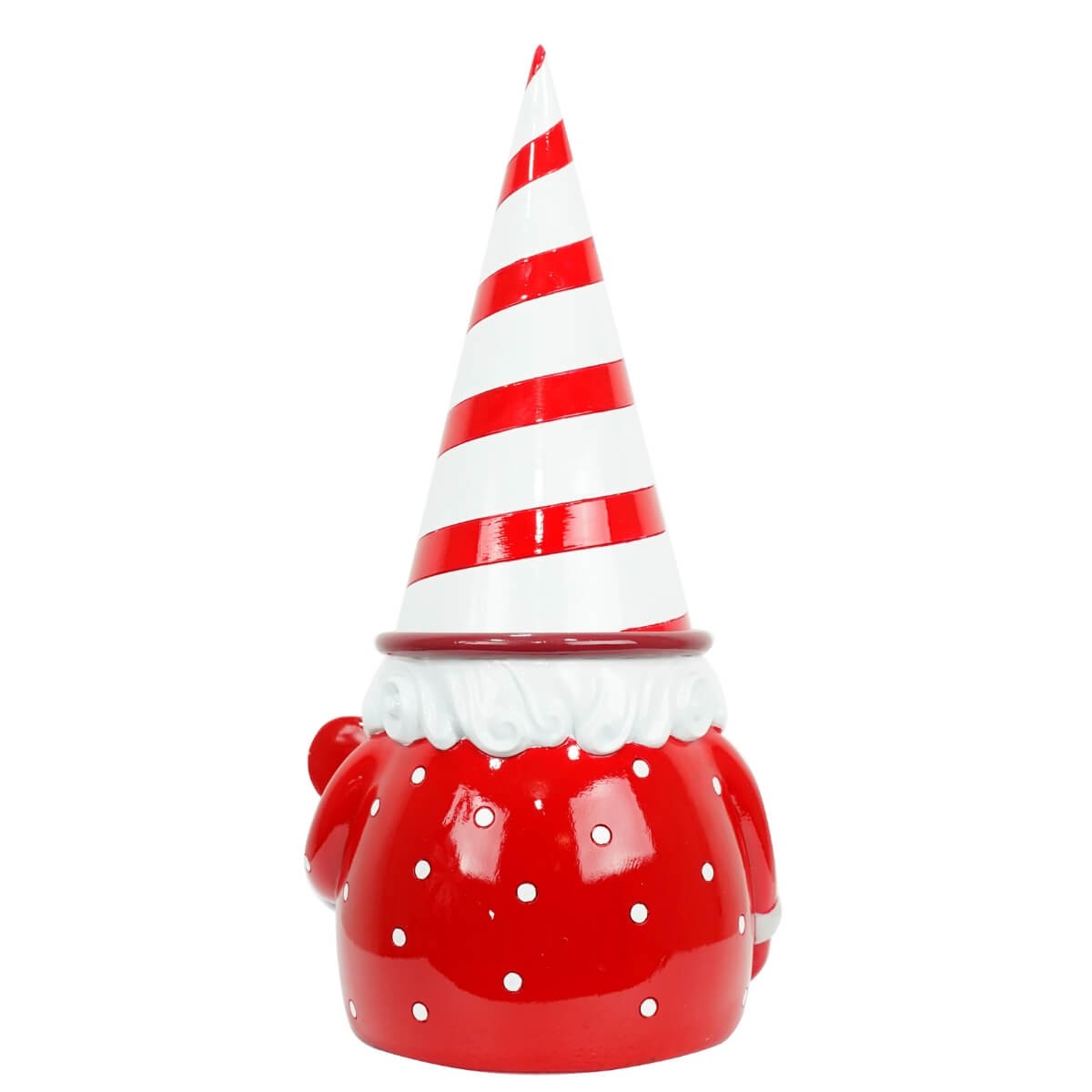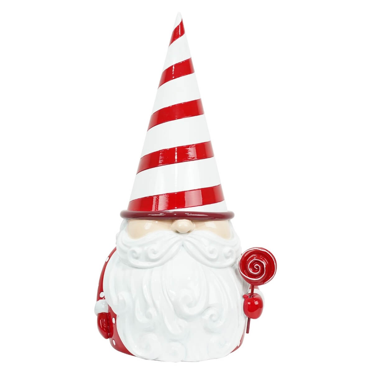 Gnomo natalizio in resina con leccalecca e cappello a strisce rosse e bianche H.41,5 cm