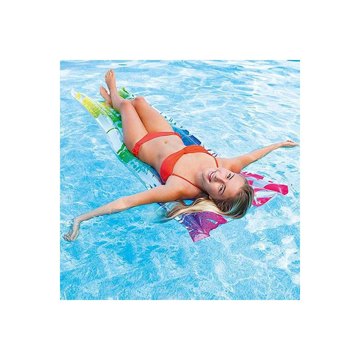 Questo fantastico materassino è progettato per offrirti il massimo comfort e stile mentre ti rilassi in piscina o al mare. Con la sua dimensione di 183x69 cm, ti offre uno spazio ampio per sdraiarti e goderti il sole in totale relax. Goditi il massimo comfort grazie al comodo cuscino integrato, che ti permette di rilassare la testa e il collo mentre ti distendi sul materassino. Inoltre, le 2 valvole di sicurezza garantiscono che l'aria rimanga al suo posto, evitando fastidiose perdite durante l'uso.