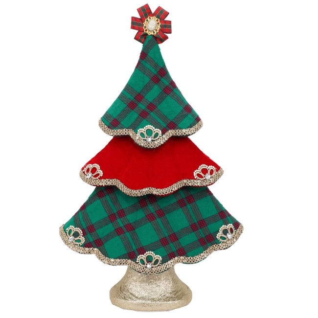 Dona un tocco raffinato e accogliente al tuo allestimento natalizio con questo elegante alberello decorativo alto 59 cm, realizzato in vellutino rosso e tessuto scozzese verde con preziose rifiniture dorate. Perfetto per valorizzare ingressi, vetrine o angoli del tuo salotto, l’alberello natalizio si distingue per la sua struttura a tre livelli con base stabile dorata, dettagli in pizzo dorato e un grazioso fiocco con cammeo in cima. Una scelta ideale per chi desidera decorazioni natalizie originali, eleganti e coordinate con stili classici o country-chic.