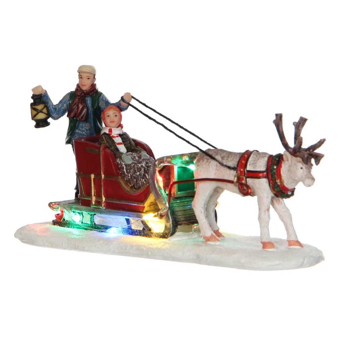 Immergiti nello spirito natalizio con la Slitta con Renna Illuminata di Luville, un incantevole pezzo che porta magia e colore al tuo villaggio natalizio. Questa dettagliata miniatura presenta una coppia vestita in abiti invernali su una slitta trainata da una renna, illuminata da luci multicolori che aggiungono un tocco di vivacità alla scena. Realizzata in poliresina di alta qualità, la figura cattura l'essenza delle tradizionali passeggiate invernali con una precisione squisita.
