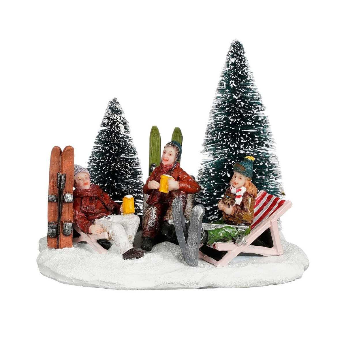 Questa figurina Luville cattura un momento gioioso di relax invernale, mostrando tre personaggi mentre si godono una pausa dallo sci. Ideale per aggiungere un tocco di vita e divertimento al tuo villaggio natalizio.