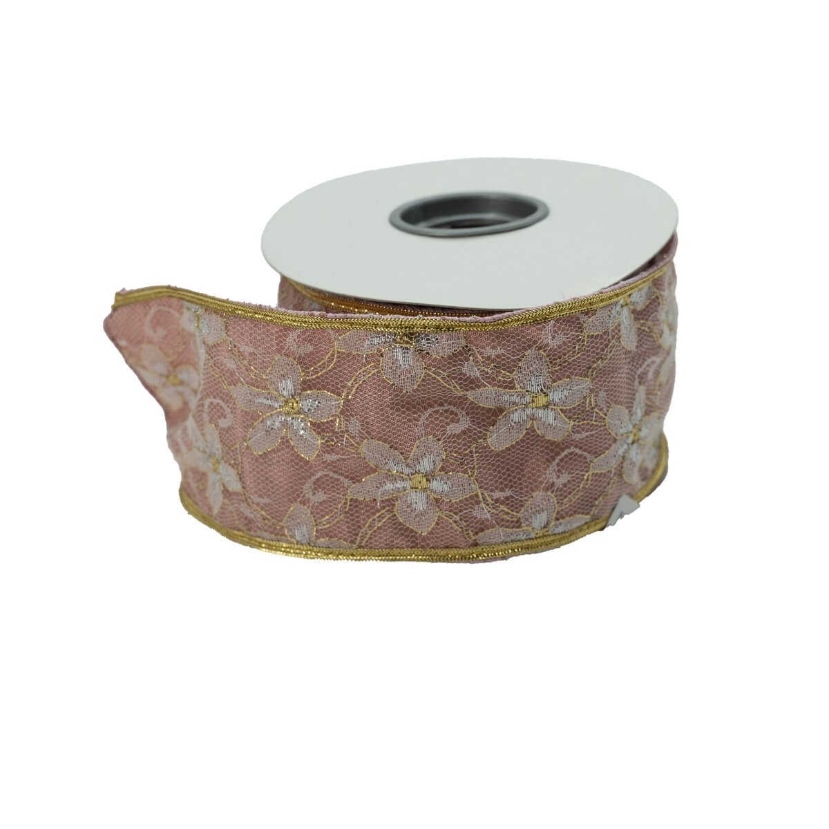 Nastro Natalizio Malva 7cm x 5m con Fiori Oro