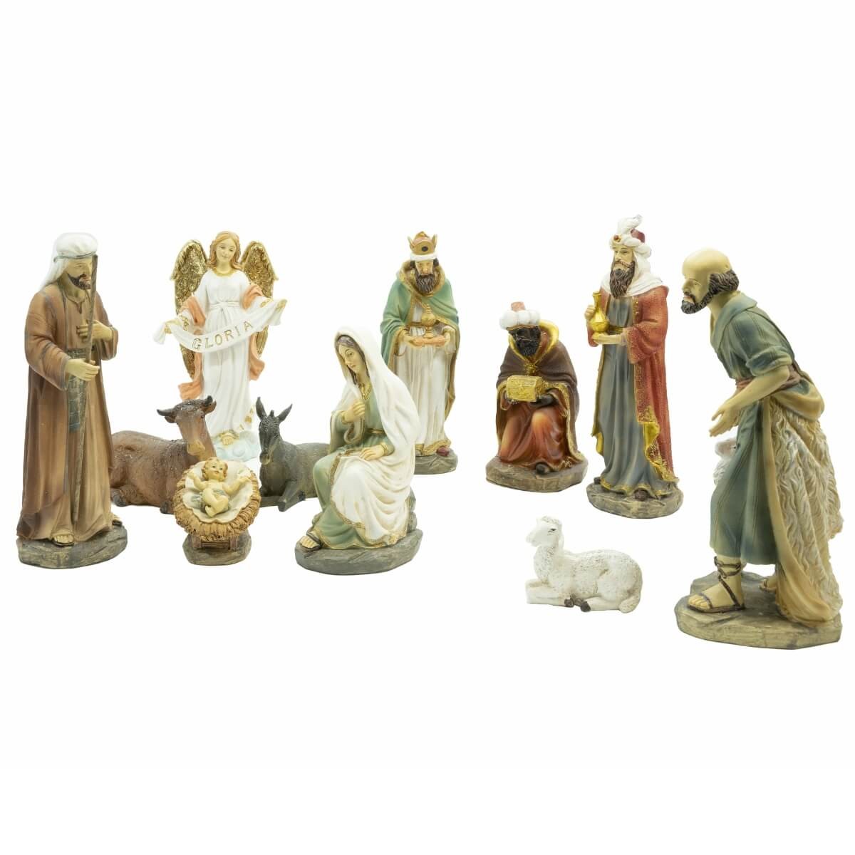 - Natività completa da 11 pezzi, con Madonna, San Giuseppe, Bambin Gesù, 3 Re Magi, bue, asino, pecora, pastore e angelo