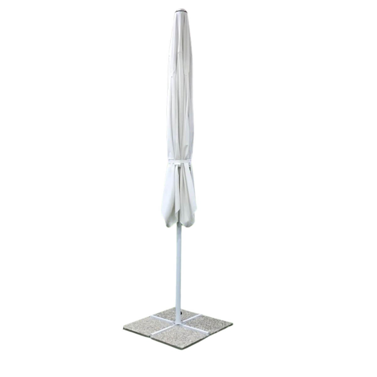 Il telo in poliestere ad alta densità da 250 g/m², di colore bianco, è impermeabile e resistente ai raggi UV, offrendo una protezione efficace dal sole e dagli agenti atmosferici, senza rinunciare all’eleganza. Il colore chiaro contribuisce inoltre a mantenere una maggiore luminosità sotto l’ombrellone.