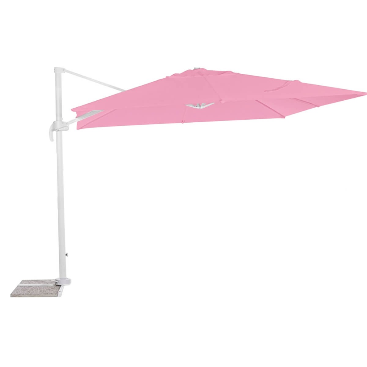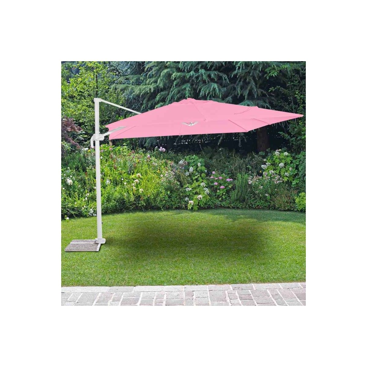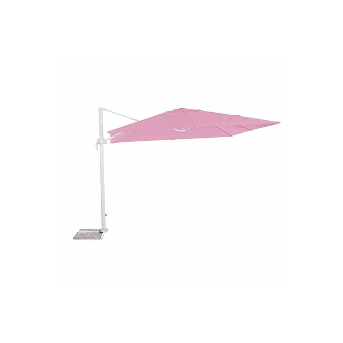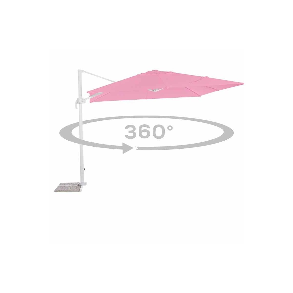Ombrellone con palo laterale e struttura in alluminio verniciata a polvere, impugnatura per proiettarlo in 5 posizioni e la pedalina per ruotarlo a 360° in modo da scegliere la posizione perfetta in base alle proprie necessità. Telo color rosa in poliestere e acrilico 250 g/m2. Base laterale completamente in acciaio resistente agli agenti atmosferici. L'ombrellone decentrato Alba è Perfetto per completare il vostro arredo outdoor creando zone d'ombra dove potervi rilassare. Grazie al palo decentrato riuscirete ad ottimizzare ogni tipo di spazio.